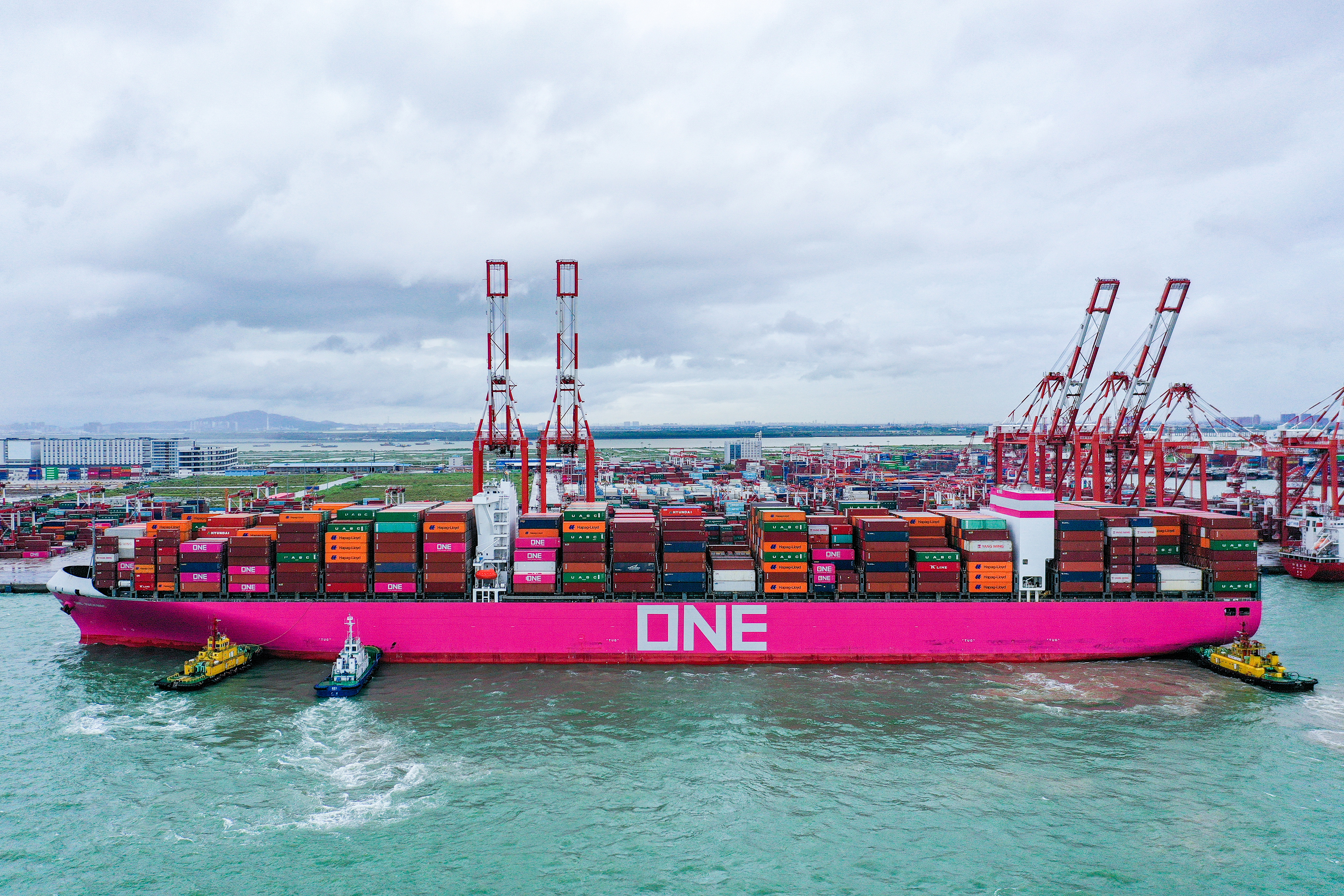 这是“第一马奇诺”轮(ONE MACKINAC)在南沙三期码头的首次挂靠,由新加坡作业完毕后驶至南沙港区,该船长365.9米,隶属于日本海洋网联船务有限公司。该粉色系列船型共有6艘,均为最大载箱量13900标准箱的15万吨级船舶。其极具少女风格的粉色船身在蓝天白云碧海的衬托下显得分外酷炫,像一位活泼可爱的粉红女郎款款而至,给钢铁铸成的南沙港区码头注入一股浪漫清新的气息。