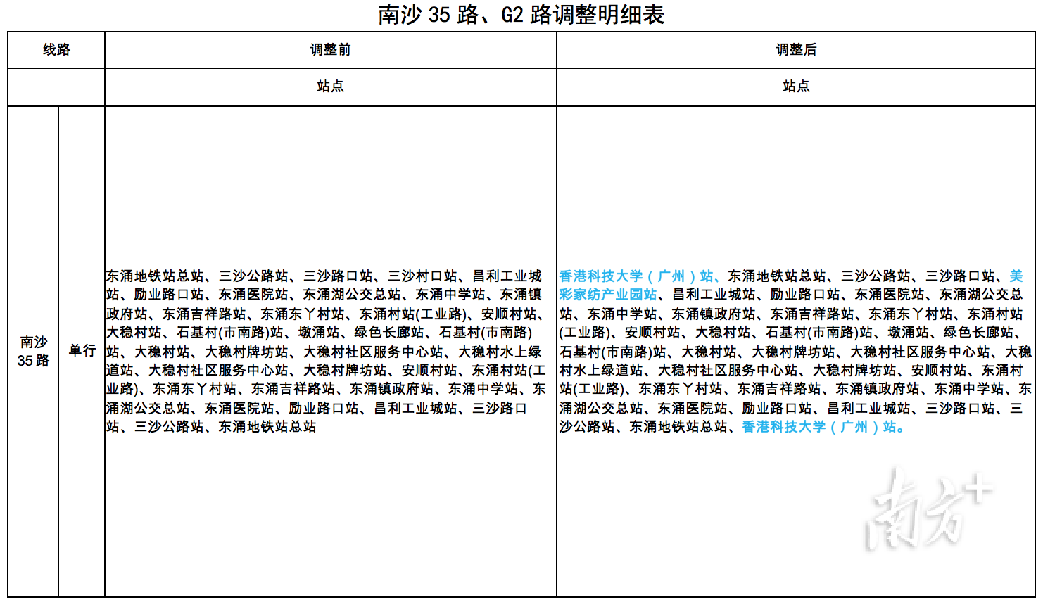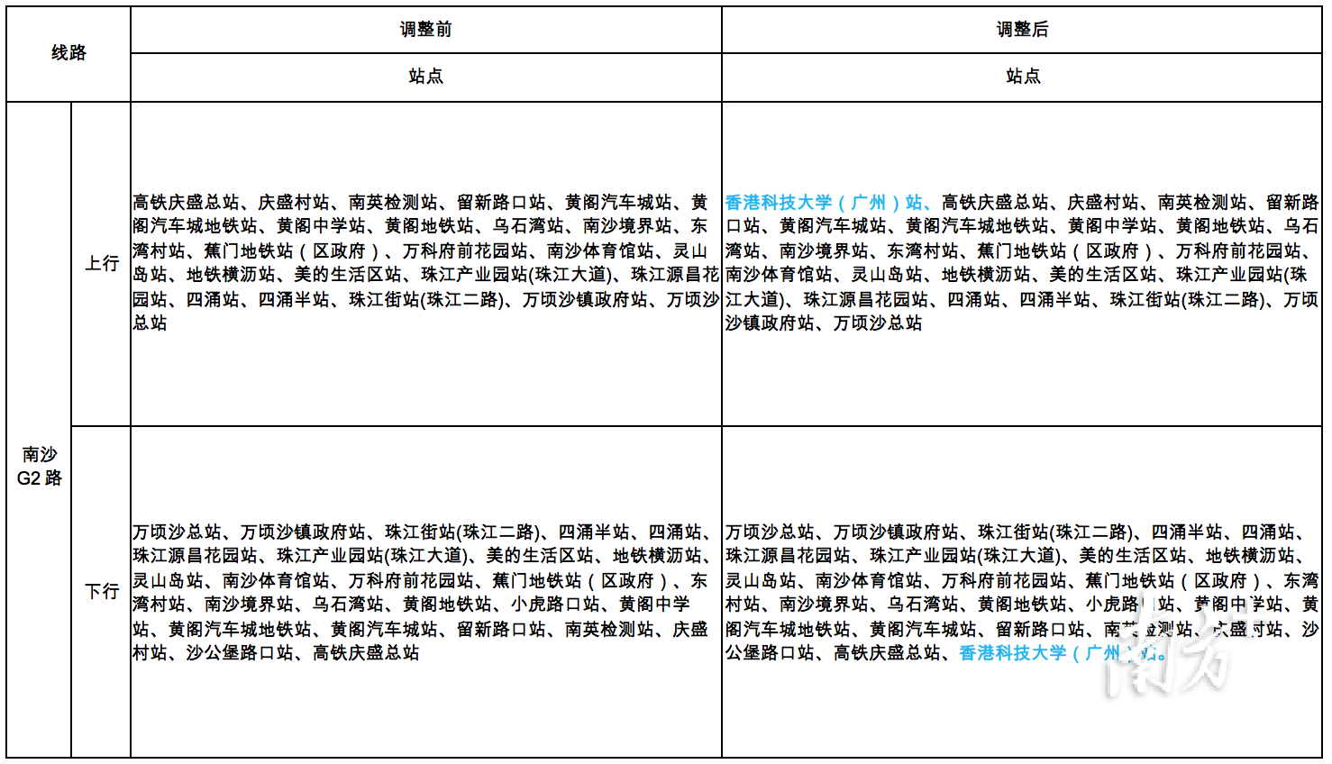 南沙G2路总站由高铁庆盛总站调整为香港科技大学(广州)站,从香港科技大学(广州)站上车,下一站就是高铁庆盛总站,可换乘4号地铁和广深港高铁,在地铁横沥站,还可换乘18号地铁,市民无论是要前往深圳、香港,还是要前往广州中心城区,出行都非常便捷。