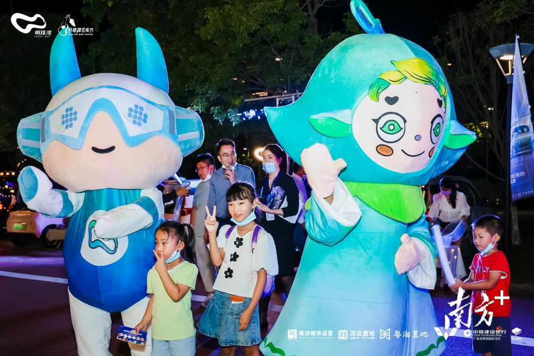 在明珠湾音乐节&江畔帐篷节首场活动现场,记者被两个绕场穿行的高大人偶吸引注意力,它们是南沙明珠湾管理局的官方IP“鸣仔”和“婉儿”。