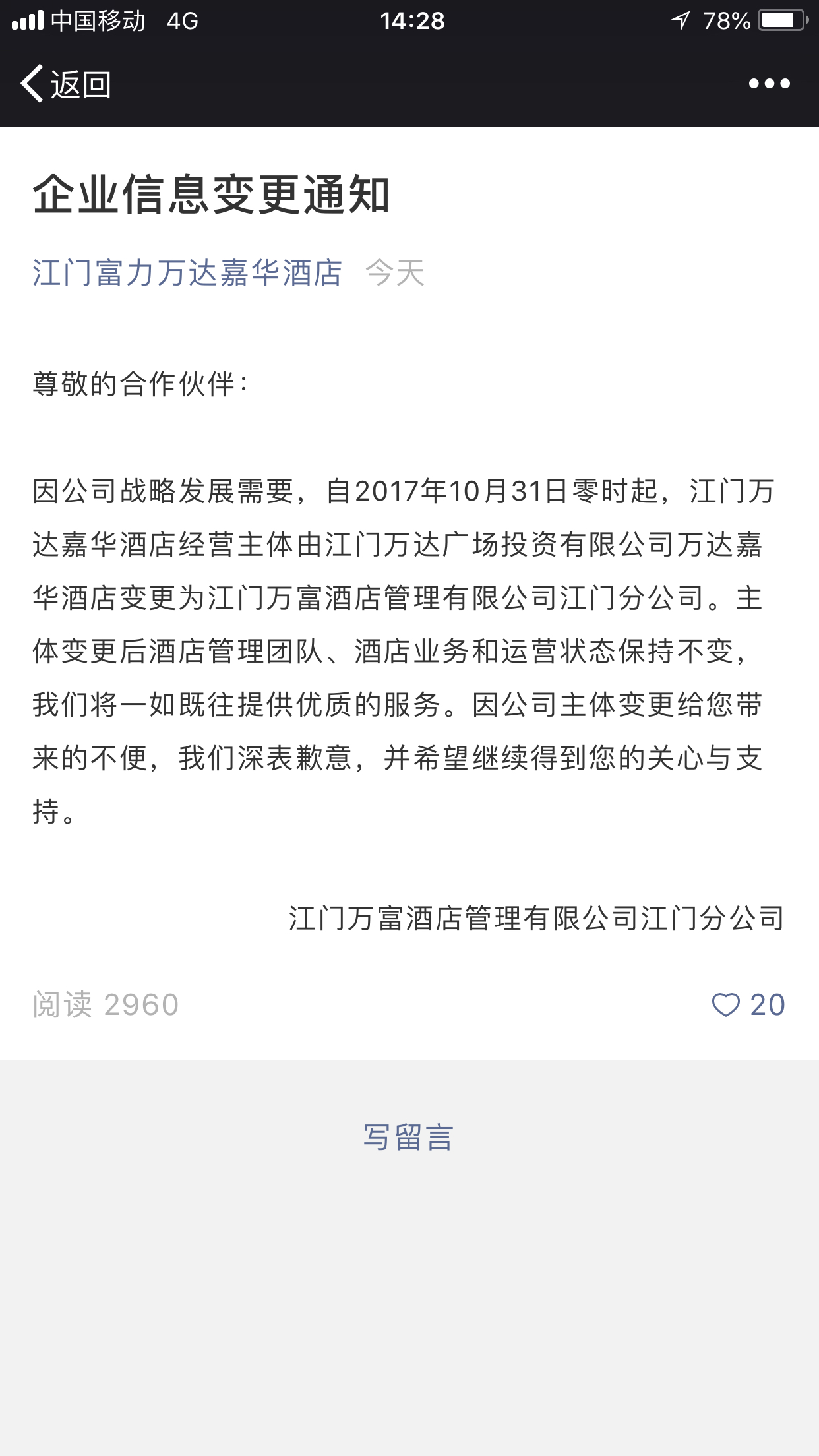 酒店方面还向记者出示了微信公众号“江门富力万达嘉华酒店”5月19日发布的一则企业信息变更通知,内容如下: