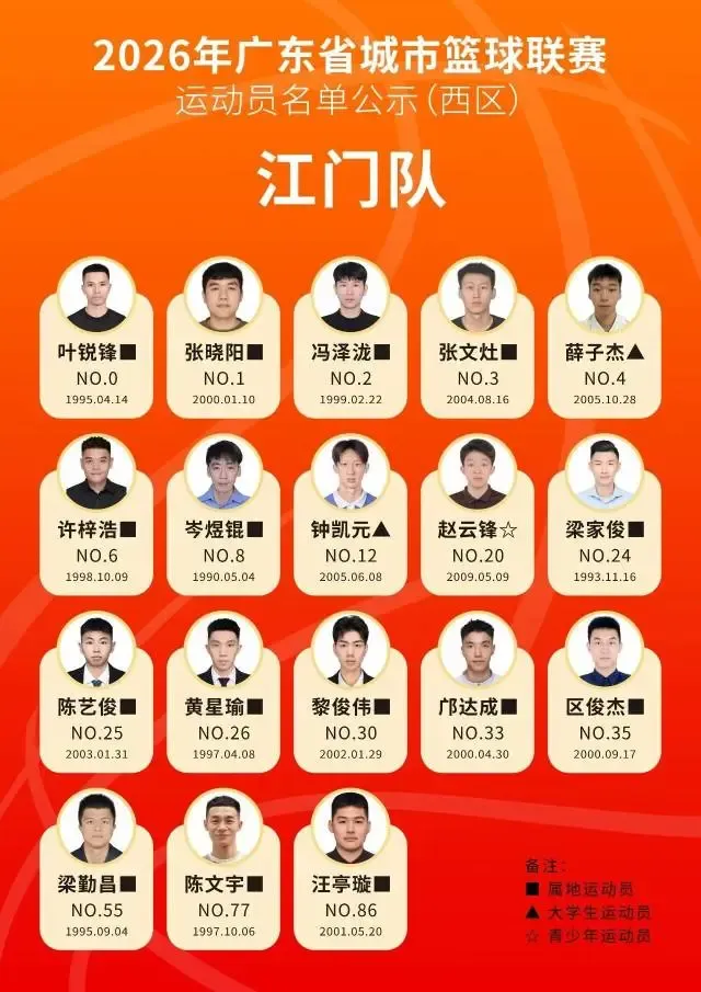 江门队以本土班底为核心,18人大名单中土生土长球员超14人,更有多位征战省联赛多年的老将压阵,经验与冲击力兼备。