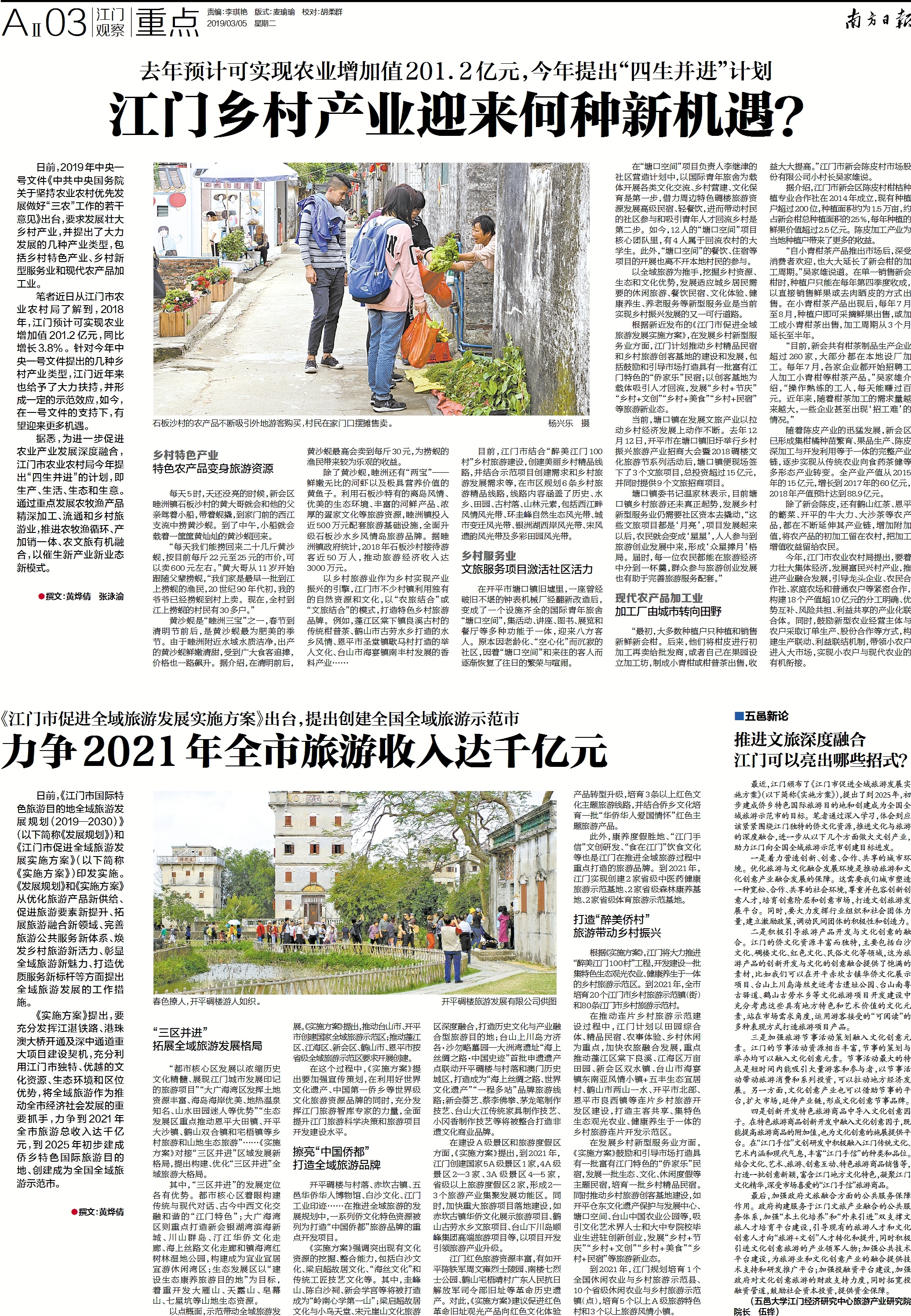 根据新近发布的《江门市促进全域旅游发展实施方案》,在发展乡村新型服务业方面,江门计划推动乡村精品民宿和乡村旅游创客基地的建设和发展,包括鼓励和引导市场打造具有一批富有江门特色的“侨家乐”民宿;以创客基地为载体吸引人才回流,发展“乡村+节庆”“乡村+文创”“乡村+美食”“乡村+民宿”等旅游新业态。