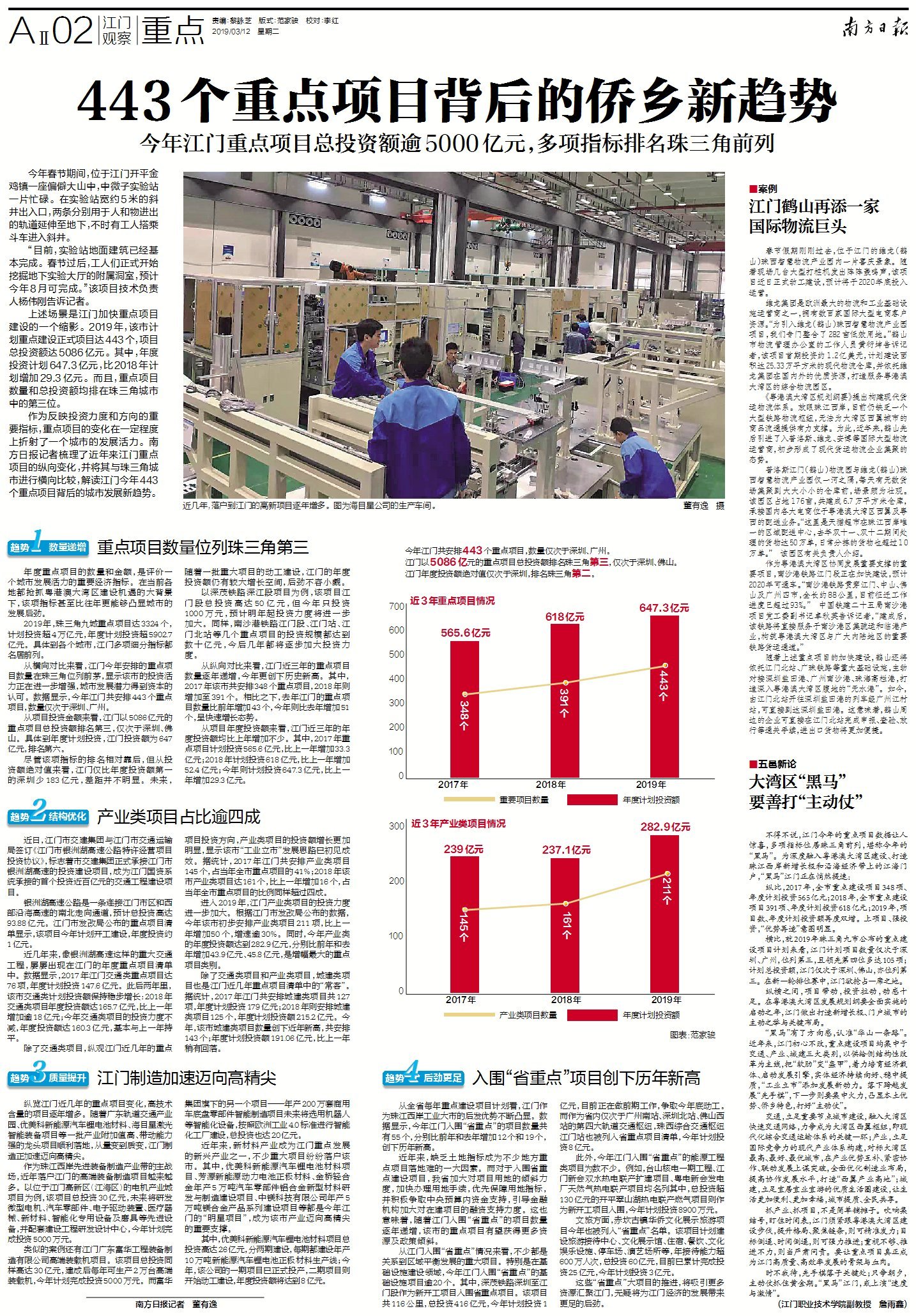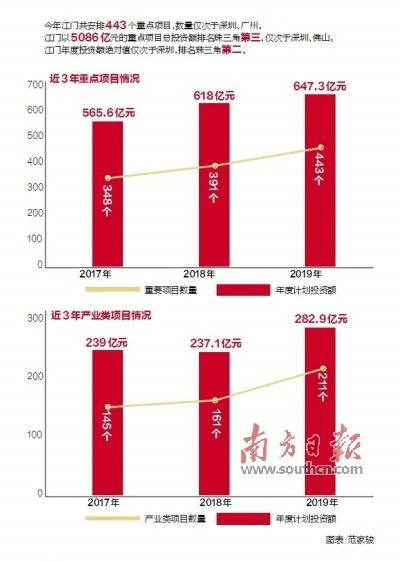 上述场景是江门加快重点项目建设的一个缩影。2019年,该市计划重点建设项目达443个,项目总投资额达5086亿元。其中,年度投资计划647.3亿元,比2018年计划增加29.3亿元。而且,重点项目数量和总投资额均排在珠三角城市中的第三位。