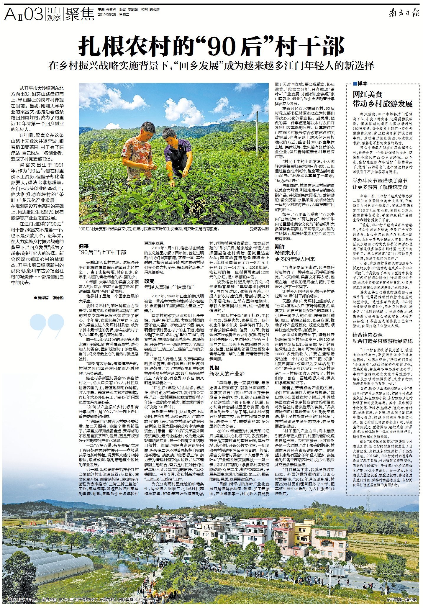 在江门,这样的“90后”村干部,梁富文不是第一个,也不是少数几个。近年来,在大力实施乡村振兴战略的背景下,“回乡发展”成为了越来越多江门年轻人的新选择。新会区双水镇田心村的林源杰、开平市塘口镇塘新村的洪炎明、鹤山市古劳镇洛社村的冯炎德……都是他们当中的代表。