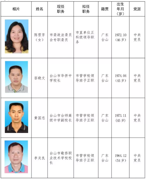 近日,中共台山市委组织部发布一则干部任用公示通告:经中共台山市委常委会议研究,陈雪芳等4位同志拟提拔任用。按照《党政领导干部选拔任用工作条例》的规定,现将拟任人选进行公示,征求党员、群众的意见。公示时间自2019年8月12日至2019年8月16日止。