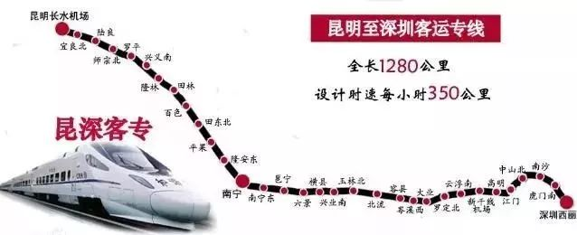 据悉,昆深高速铁路由渝昆高铁的昆明长水机场站引出,经兴义、百色、南宁、玉林、云浮、江门、高明等地,接入深圳西丽站,全长1280公里左右,设计时速为250-350KM/H。