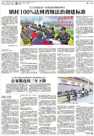 近年来,江门市法治建设不断取得新成效。今年7月,2018年度法治广东建设考评结果出炉,江门考评得分在90分以上,获评优秀等次。这是江门首次获评法治广东建设优秀城市称号,标志着江门法治建设迈上新台阶。