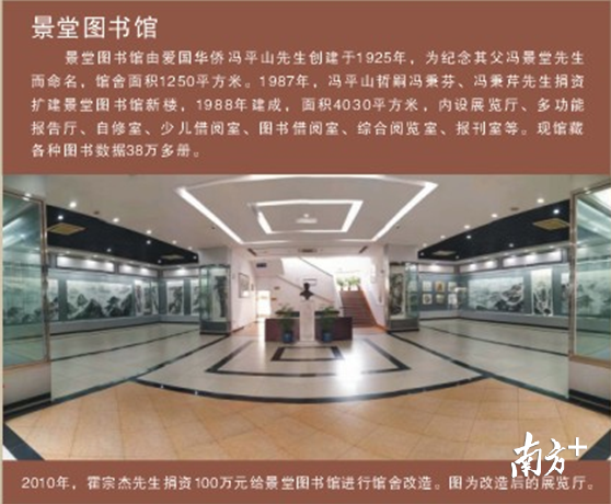 1986年,冯秉芬、冯秉华先生策巨资建设景堂图书馆新楼,新楼与旧楼连通使用,面积达5280平方米。此外,为推动图书馆的发展,冯氏家族还向图书馆赠送大量设备、图书等。