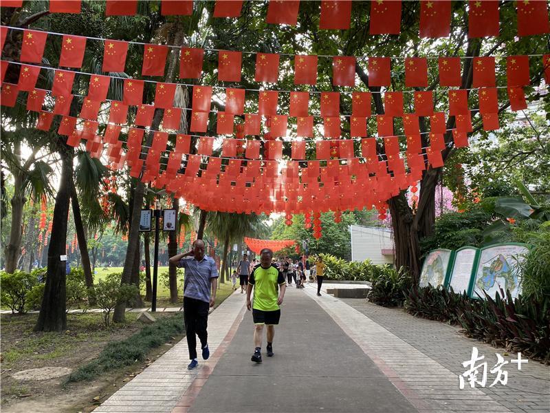 此前,江门市东湖公园共投入1200万元,推动北园区的品质提升,重点改造植物景观。为了迎接国庆,公园积极悬挂国旗、布置宣传标语宣传画、重点区域布置时花组景。