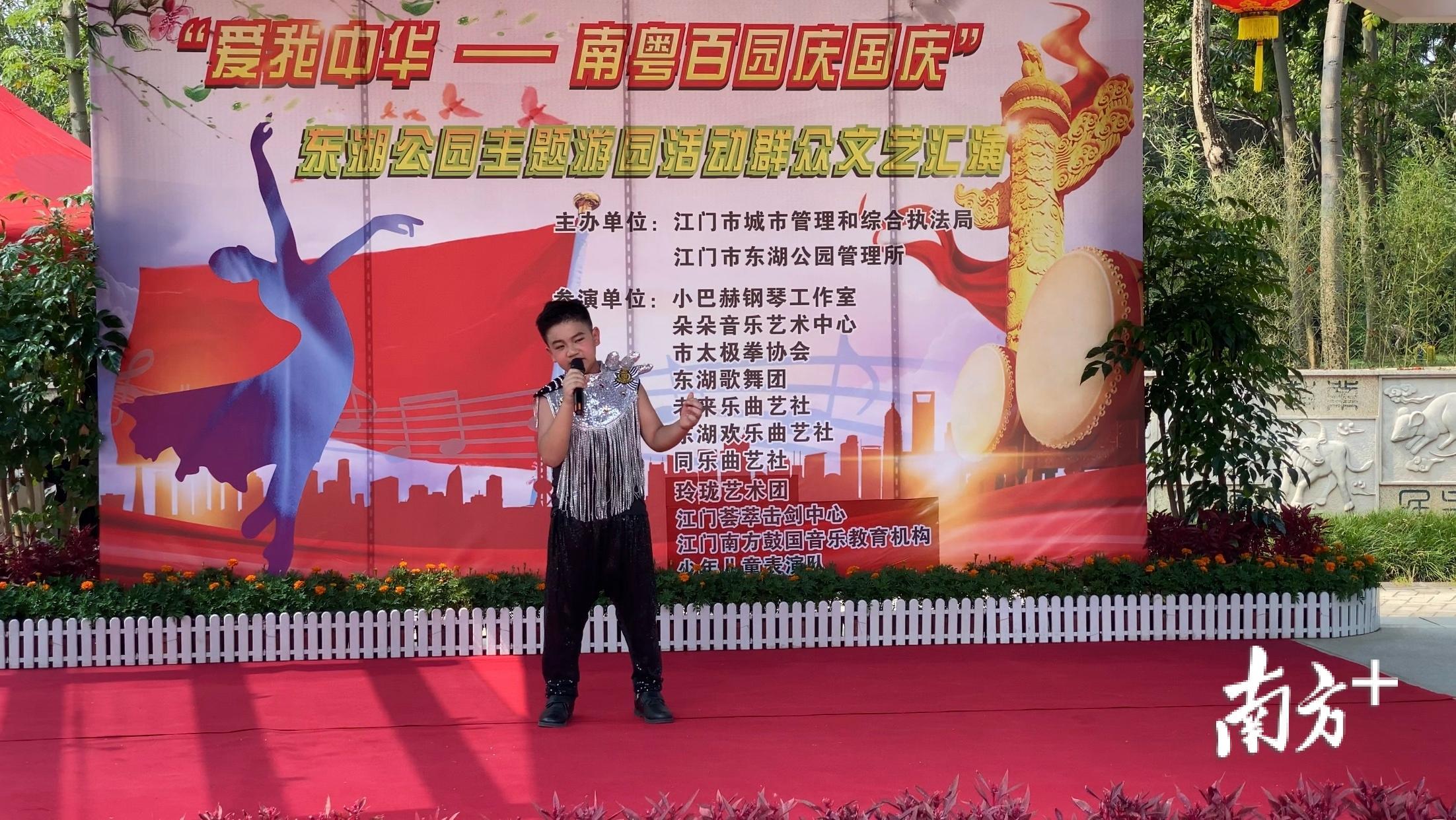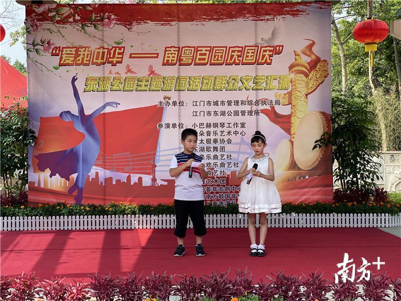 10月1日上午,江门市东湖公园举行“爱我中华——南粤百园庆国庆”主题游园活动群众文艺汇演。十多位小朋友走上北园广场搭建的群众文艺汇演舞台,为群众带来童声合唱、古筝合奏、小提琴合奏、朗诵等表演。