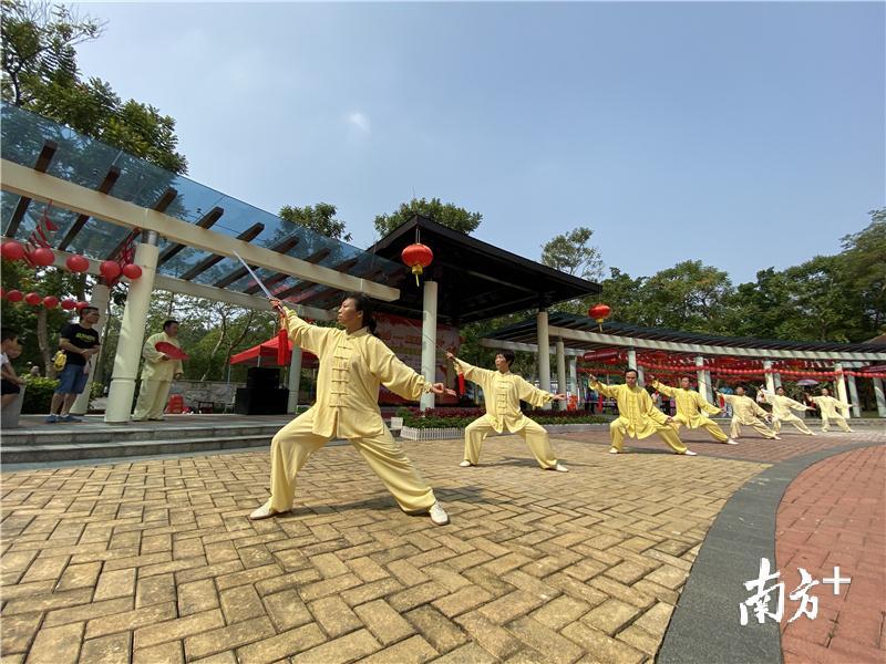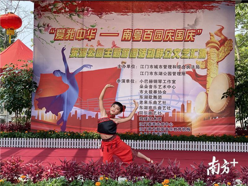 在装扮一新、张灯结彩的园区内,江门举行丰富的主题文娱活动,营造出一片欢乐喜庆、文明的节庆氛围。国庆期间,东湖公园将举办以“爱我中华,南粤百园庆国庆”为主题的系列活动,开展文艺汇演、图片展、灯谜游园等活动。其中,群众文艺汇演在10月1日至5日上午举行。每天由不同的队伍上台表演,带来包括粤剧、独舞、葫芦丝演奏、太极等精彩表演。