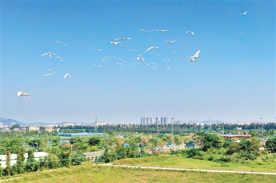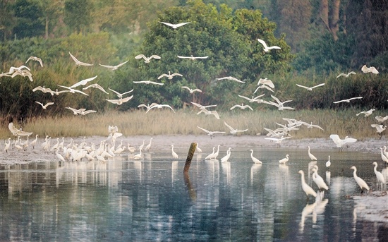 “两个黄鹂鸣翠柳,一行白鹭上青天。”不少人以为这样的风景可能要在远离城市的地方才能看到,但随着城市生态环境越来越好,如今不少鸟儿选择在市区附近安家。近日,潮连西江边、礼乐东红村等地都见到成群结队的候鸟在觅食、栖息,其中以鹭鸟最多、最突出。