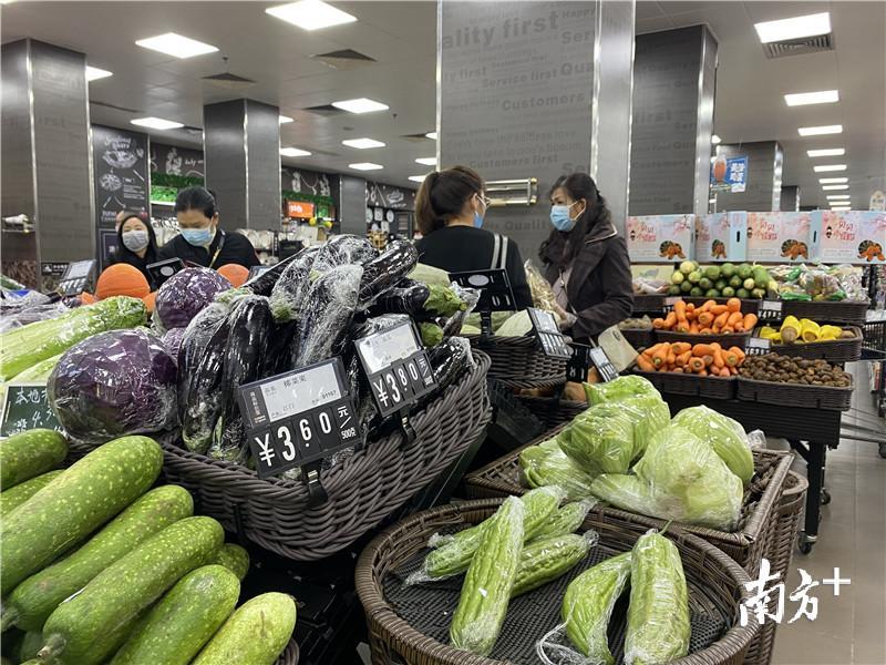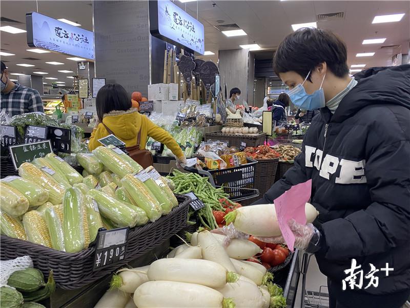 市民杨女士正往购物车内添置菜心、大白菜、萝卜等一些比较耐放的蔬菜。杨女士告诉记者,她现在基本是每两天出一趟门买菜买肉,较之以往,超市里的菜价涨价幅度不大,有部分蔬菜价格甚至还降价了,部分肉类的价格略有涨价。