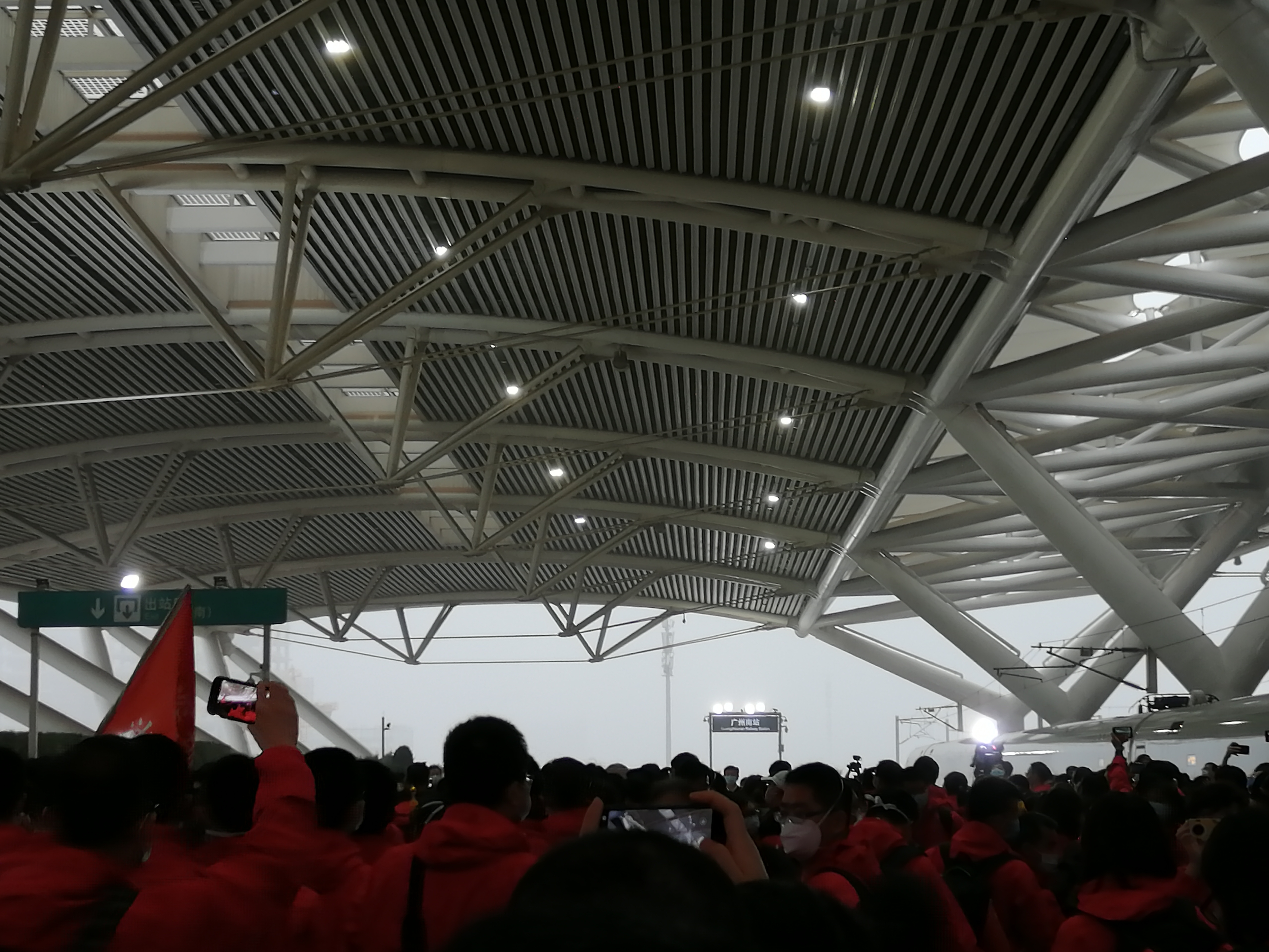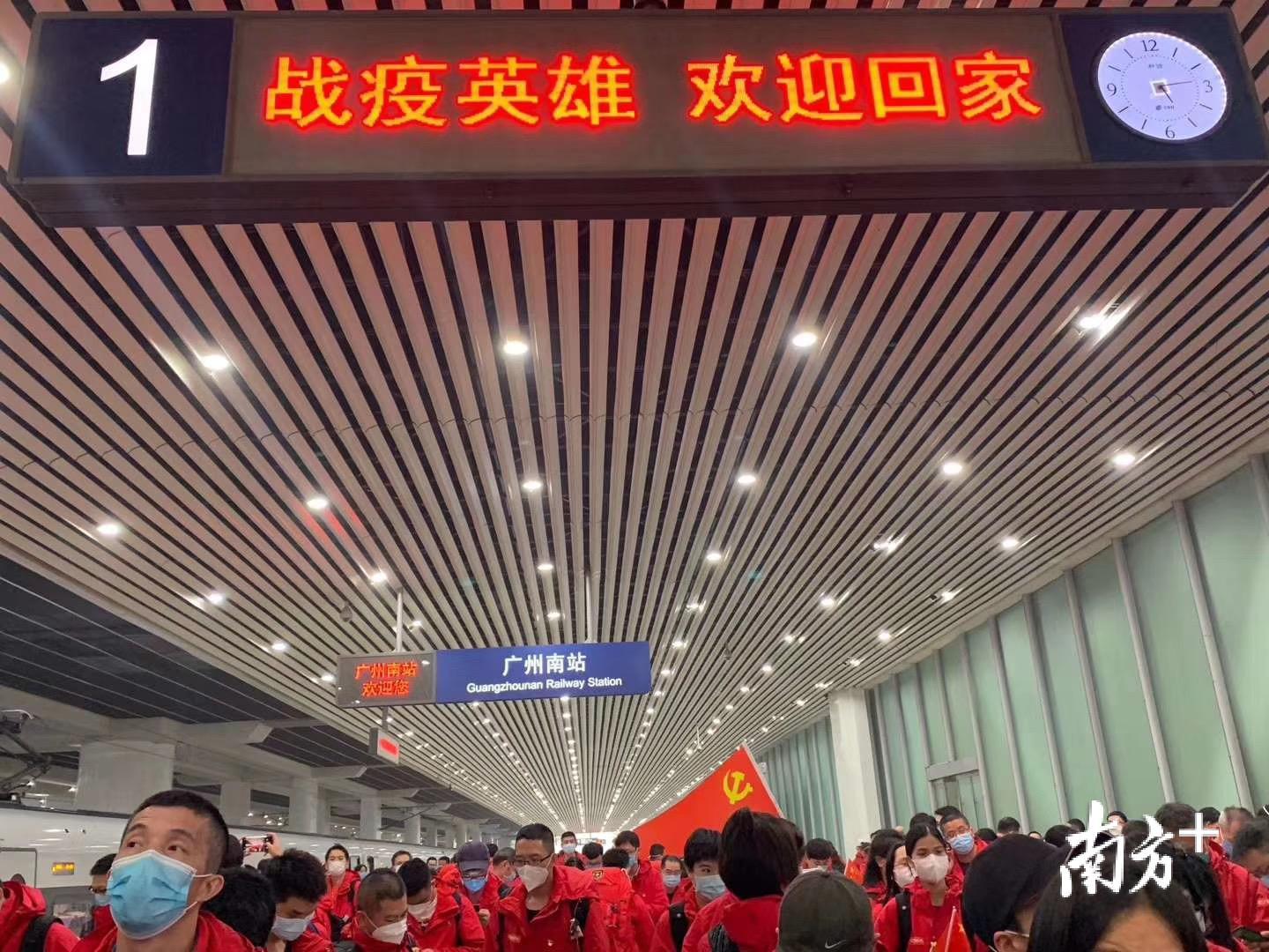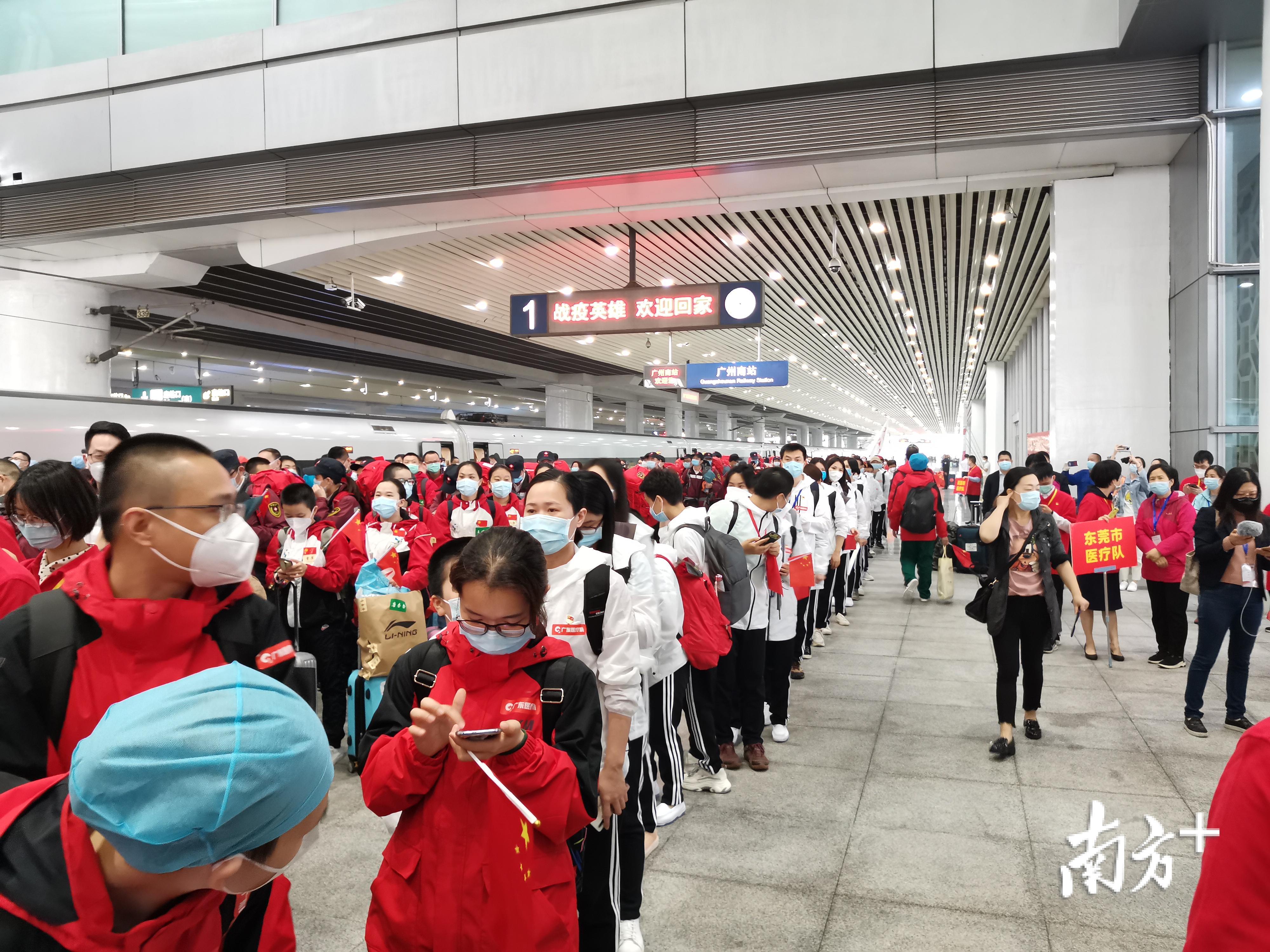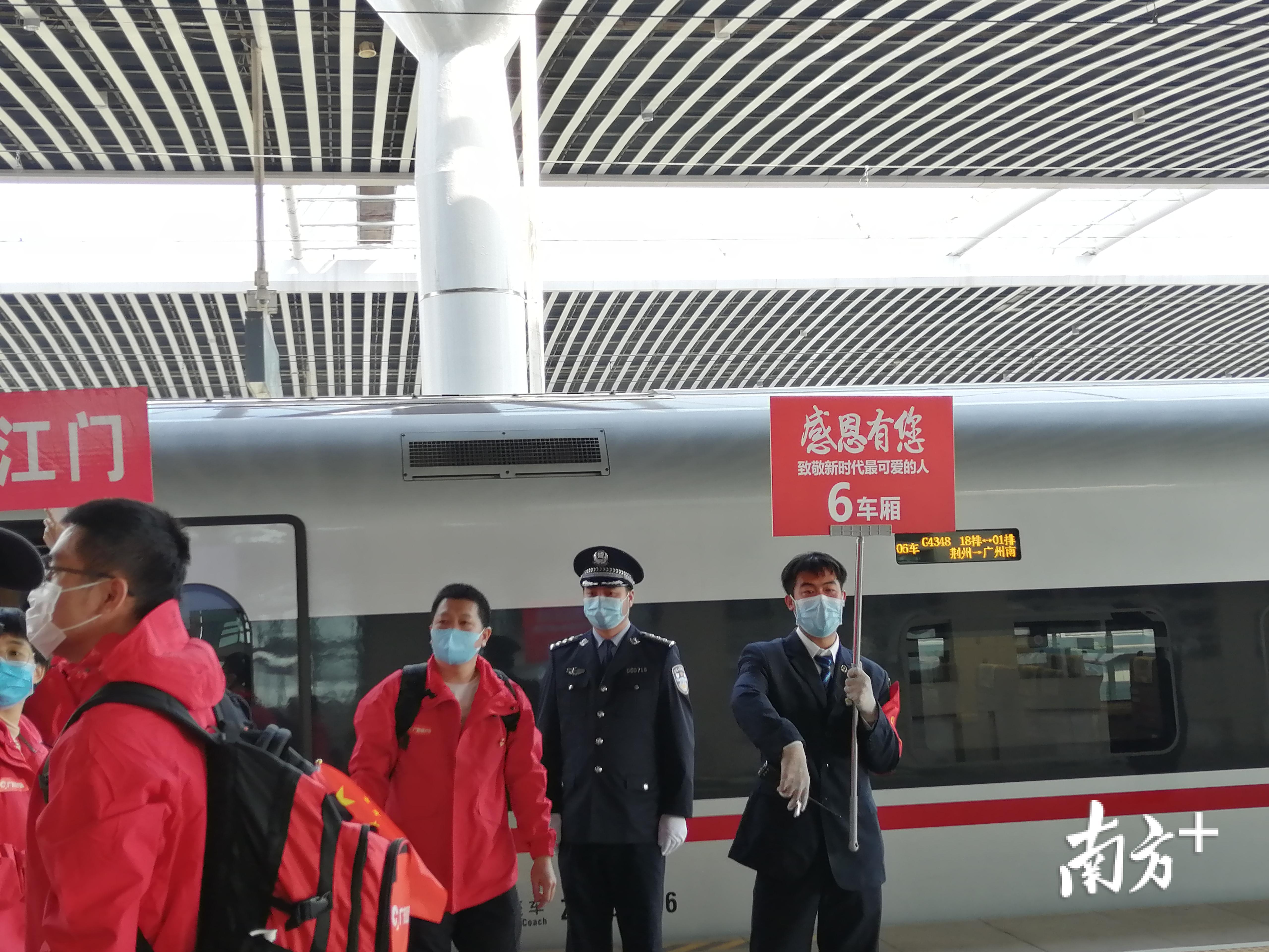 G4348次列车到达广州南站。江门市第二批支援湖北医疗队队员正在出站。