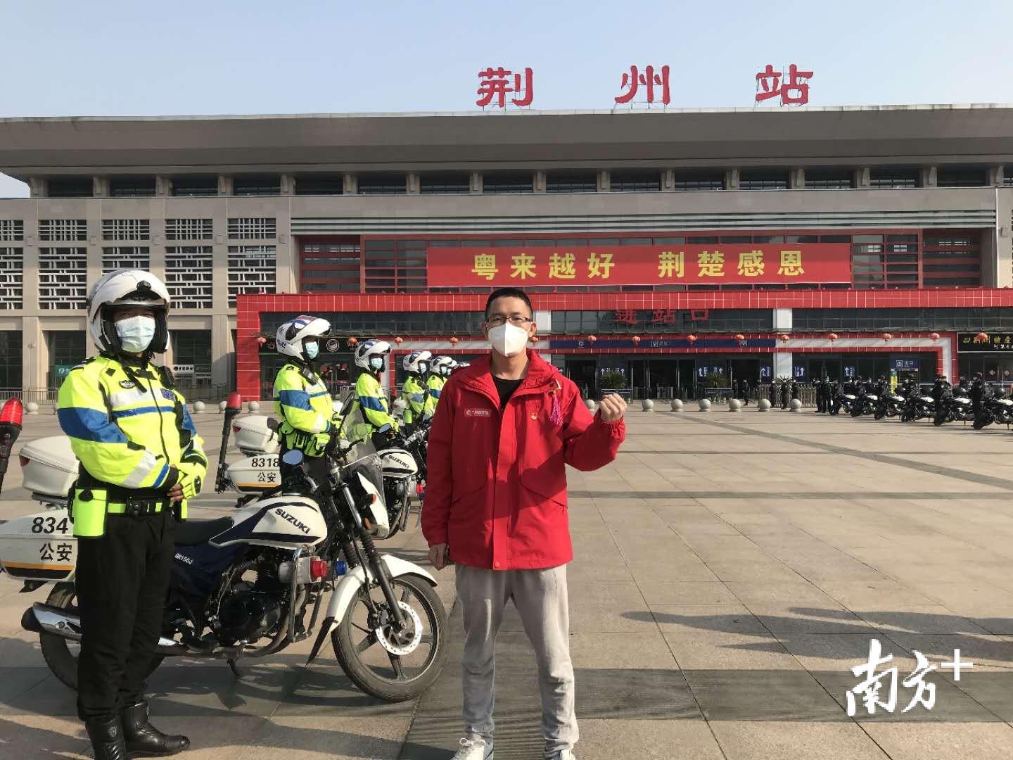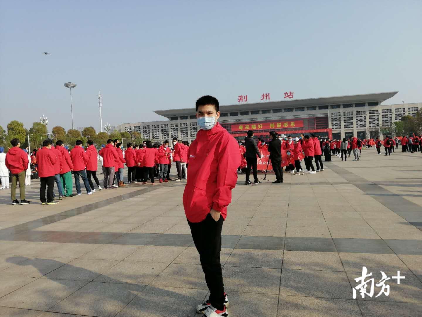 #江门市第二批支援湖北医疗队#刚刚,队员到达荆州站,准备进站。图为江门市五邑中医院重症医学科护师甄坚亮。