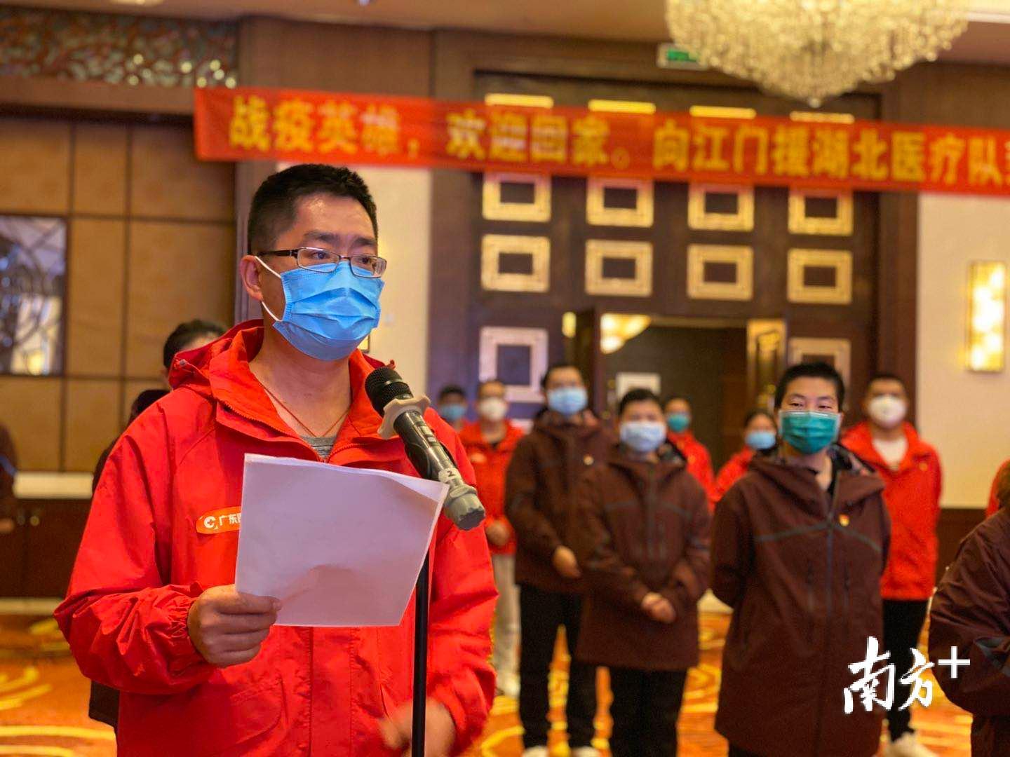 江门市第一批支援湖北医疗队队长、新会区人民医院重症医学科副主任医师钟景良说,感谢江门市委市政府一直以来对我们的关心和关怀,感谢各级各相关部门对我们的大力支持,你们是我们坚强的后盾,心灵的港湾。