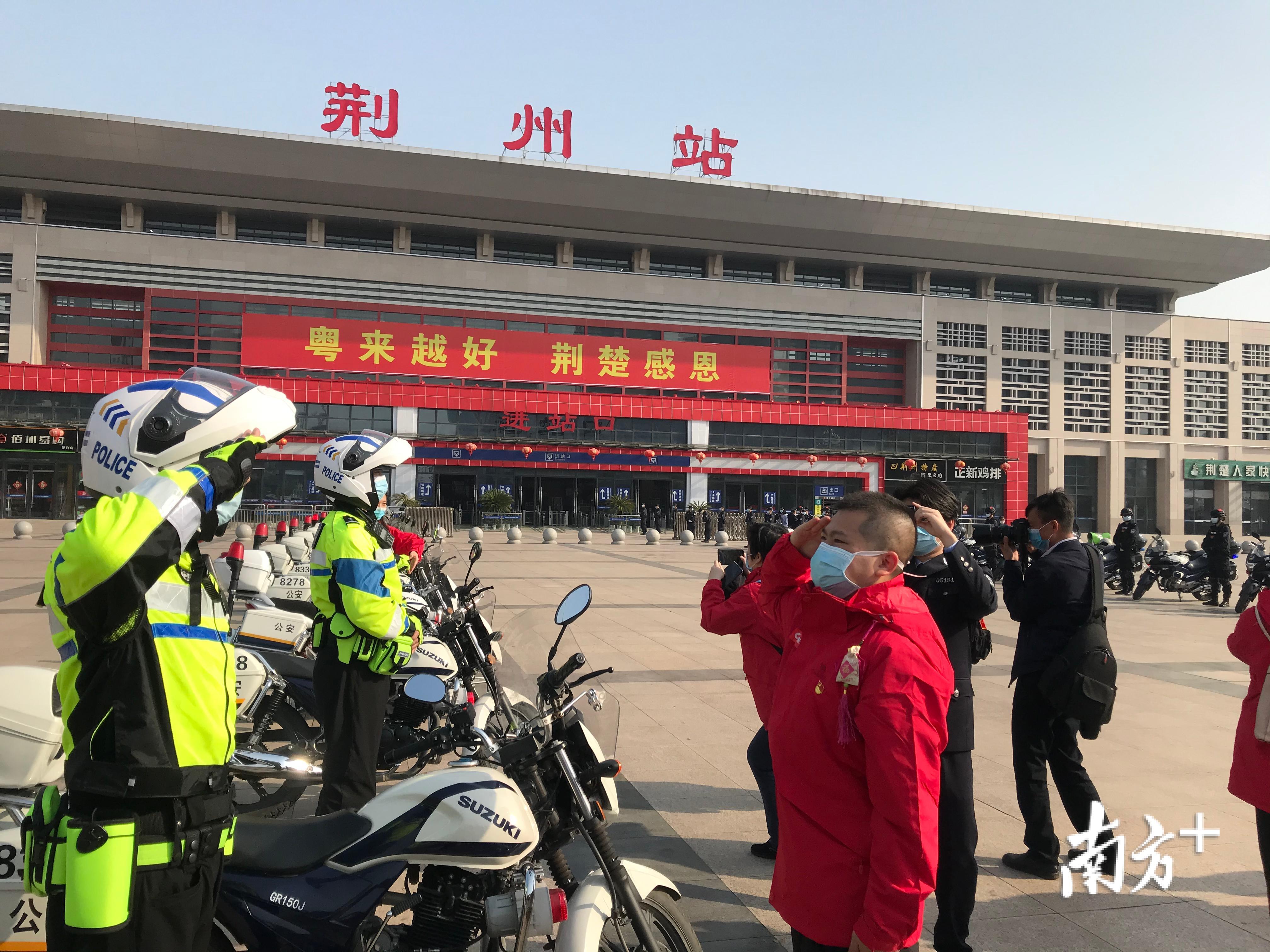 #江门市第二批支援湖北医疗队#队员、开平市中心医院医生温嘉强在荆州站外与警察相互敬礼。
