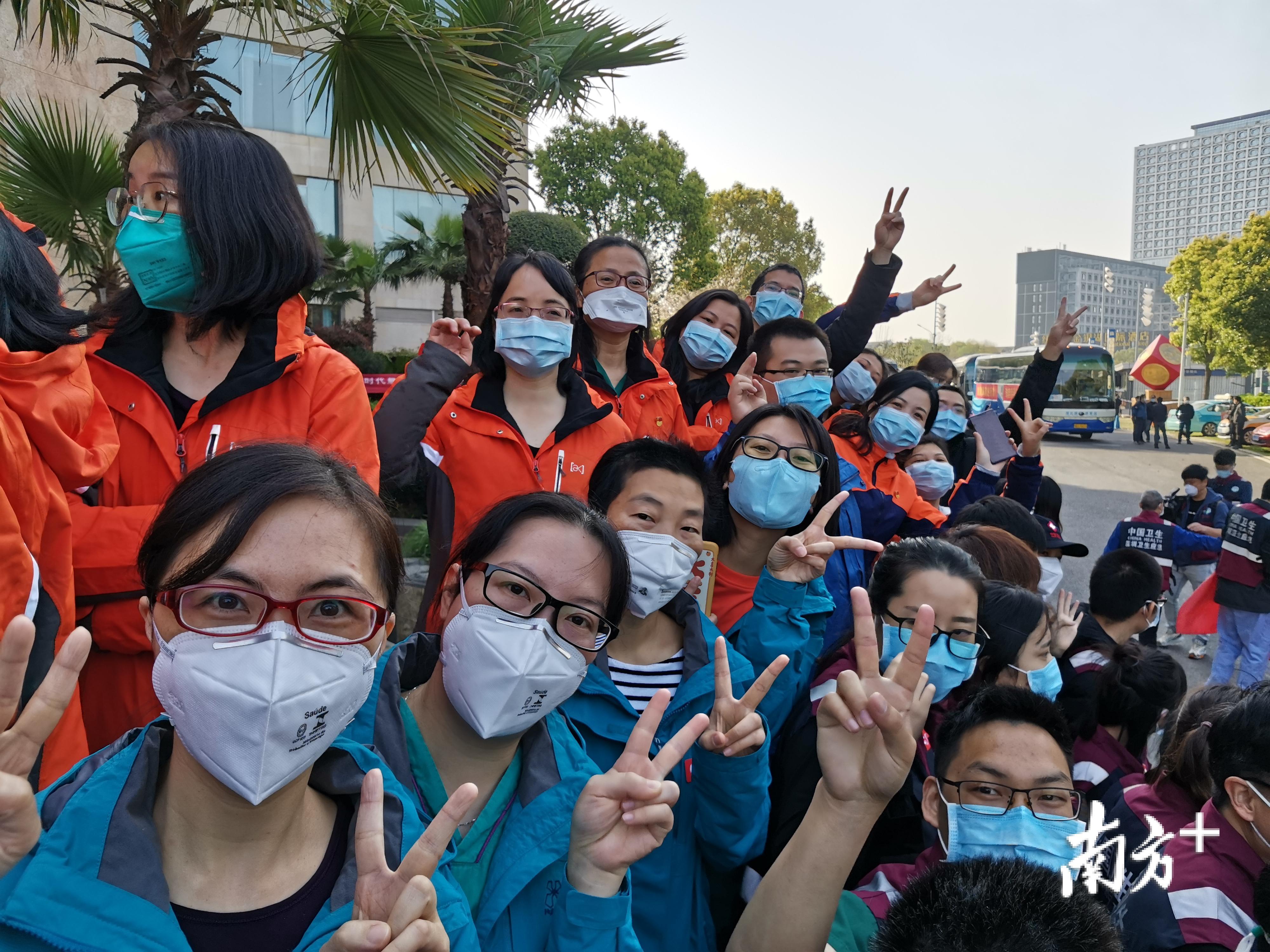#江门市首批支援湖北医疗队#队员们比出“胜利”手势。