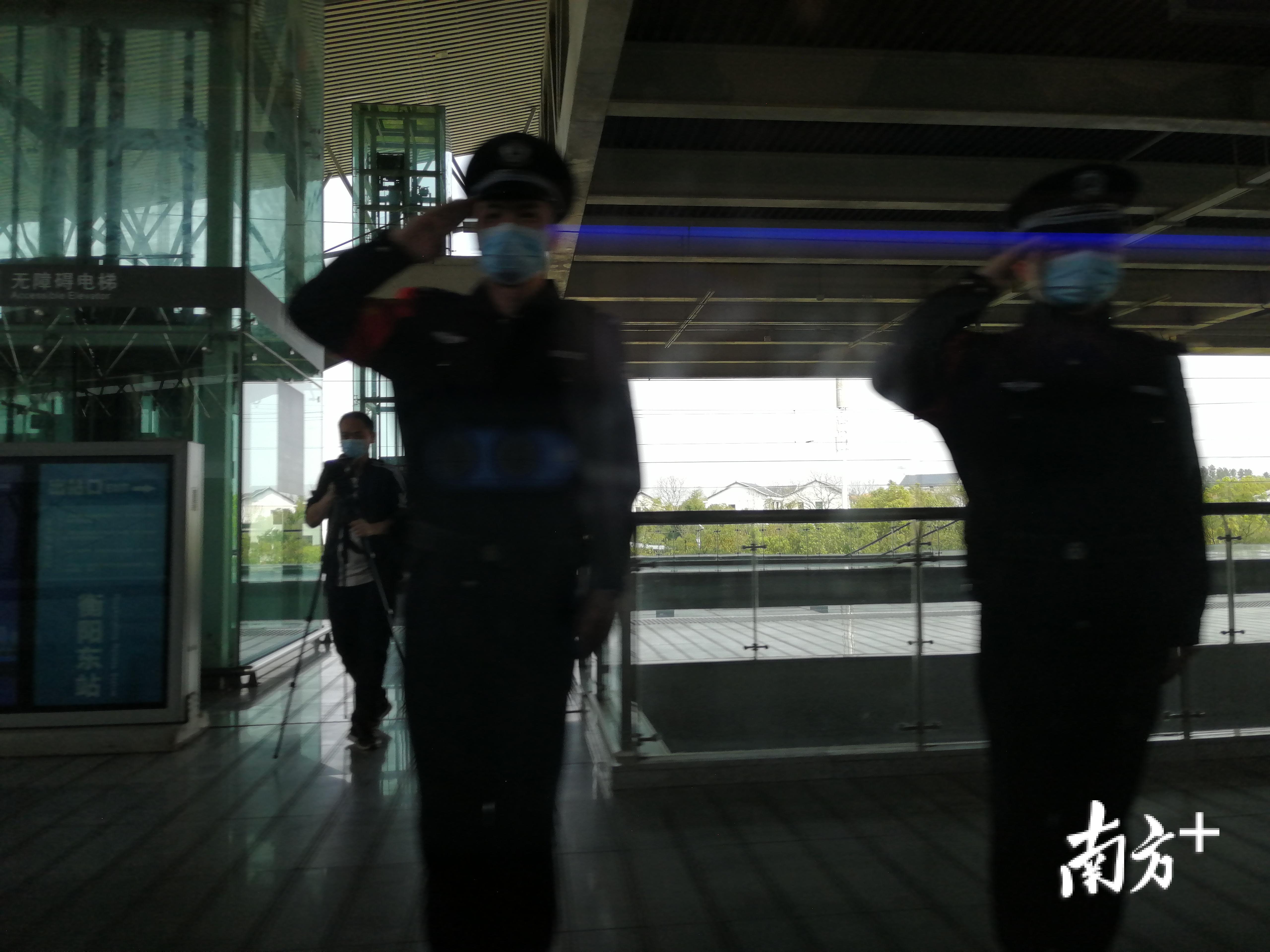 G4348次列车驶过衡阳东站,车站工作人员向医疗队队员敬礼致敬。列车还为返粤的医疗队队员准备了一份下午茶。