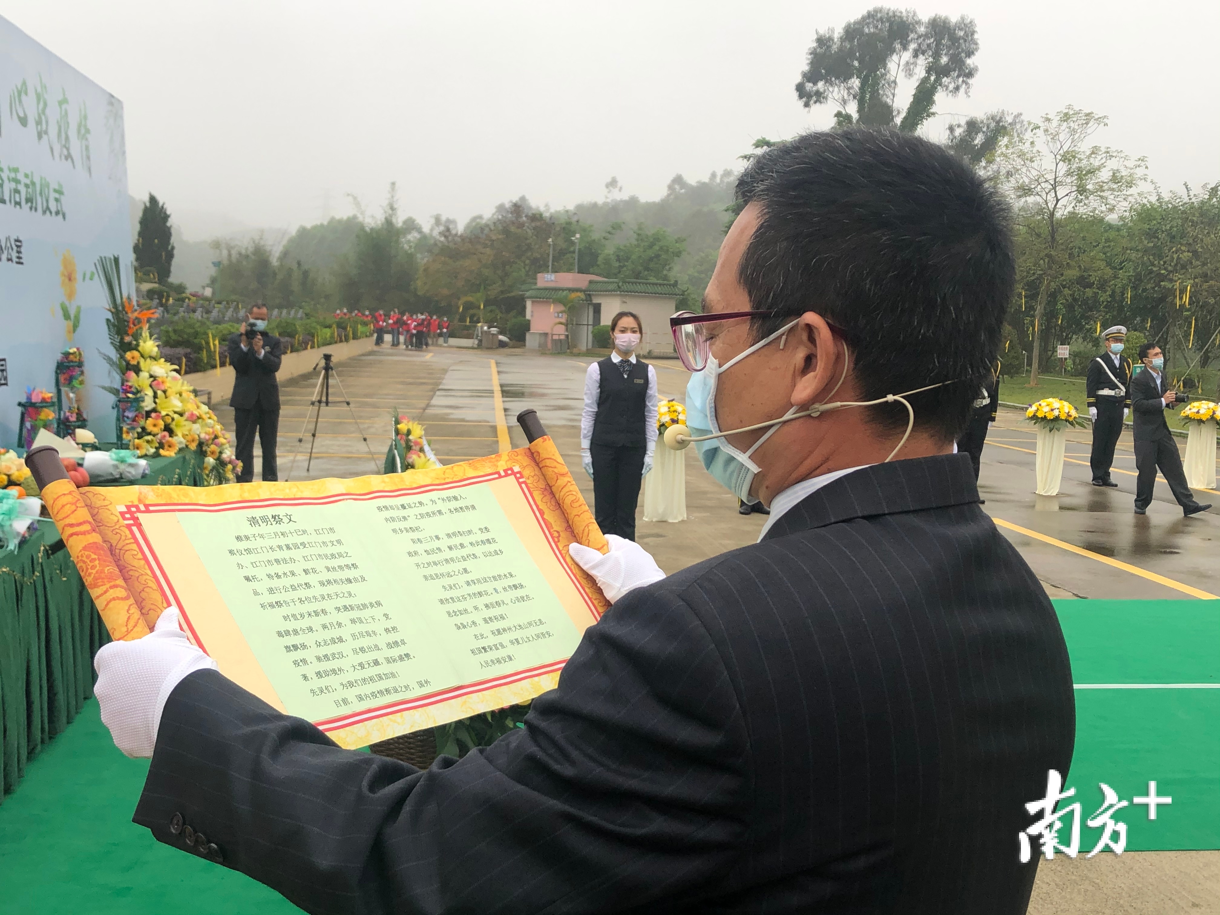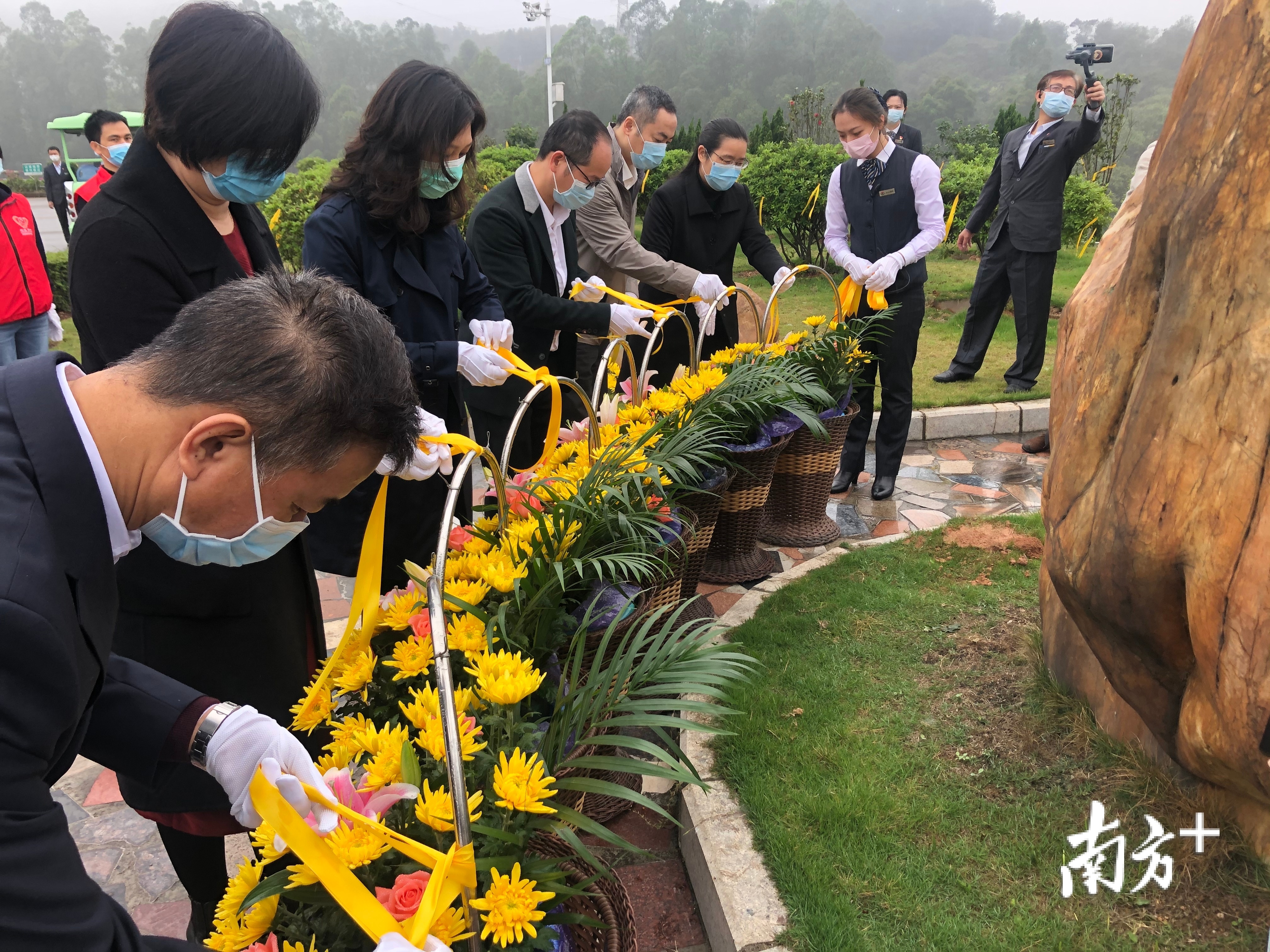 条条丝带飘扬,朵朵杜鹃花飘香,束束黄菊花诉说着思念和祈祷着祝福。 在主会场江门市殡仪馆,鲜花代祭公益仪式分为六大环节,分别是恭行三献礼、诵读祭文、为每个墓位敬献菊花、系挂代表思念的丝带、放莲花灯祈愿以及书写张贴追思祝福寄语。