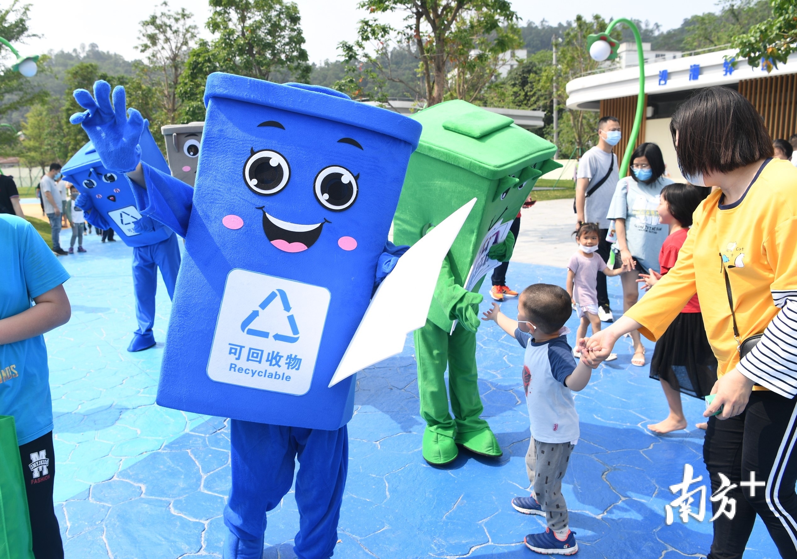 在现场,蓝、红、绿、灰四种颜色的垃圾桶卡通人偶,颜色格外鲜艳夺目,他们献上劲歌热舞之余,还与小朋友热情互动。有的小朋友想与卡通人偶握握手,一旁的工作人员还贴心地拿出酒精喷雾先给人偶手套消毒。