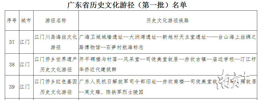 5月11日,广东省文化和旅游厅于官网公布了第一批广东省历史文化游径共64条,其中,江门市入选3条,分别是江门川岛海丝文化游径、江门侨乡世界遗产历史文化游径、江门侨乡红色基因历史文化游径,涉及相关历史文化和旅游资源点共15个。
