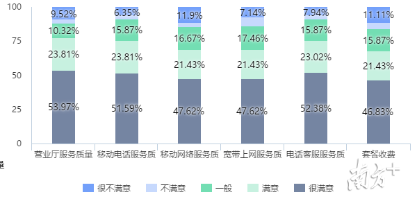 在调查中,近7成受访者对通信运营商的营业厅服务质量、移动电话服务质量、移动网络服务质量、宽带上网服务质量、电话客服服务质量、套餐收费表示“满意”或“非常满意”。