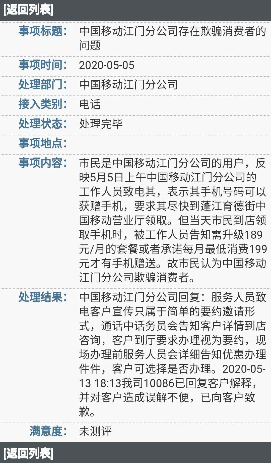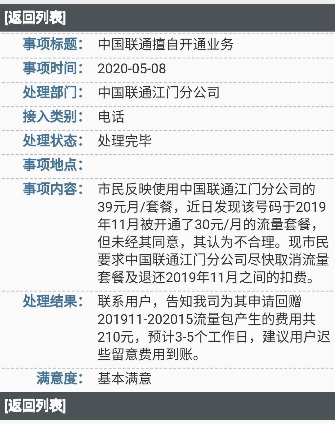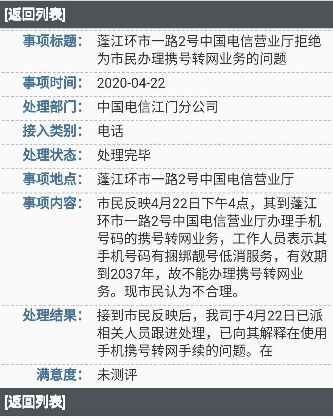 例如,有市民反映,5月5日上午中国移动江门分公司的工作人员致电其表示,其手机号码可以获赠手机,但市民到店才发现获赠手机有条件,运营商已向客户致歉。有市民反映,中国联通江门分公司未经其同意,开通30元/月的流量套餐。收到反映后,运营商为其申请回赠相关费用。有市民反映4月22日到中国电信营业厅办理携号转网业务时,工作人员称其号码因捆绑靓号低消服务,有效期到2037年,故不能办理携号转网业务。收到反映后,运营商已向其解释使用手机携号转网手续的问题。