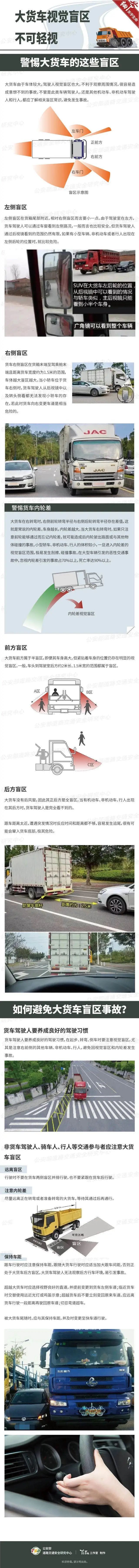 交警提醒广大交通参与人要注意远离大货车盲区:1.行人要与直行的大型汽车,保持2米以上的安全距离。2.非机动车要与直行的大型汽车,保持3米以上的安全距离。3.当大型汽车转弯时,不要抢行,不要试图超越。4、小型汽车、摩托车等体型较小的车辆,不要与大货车并行。