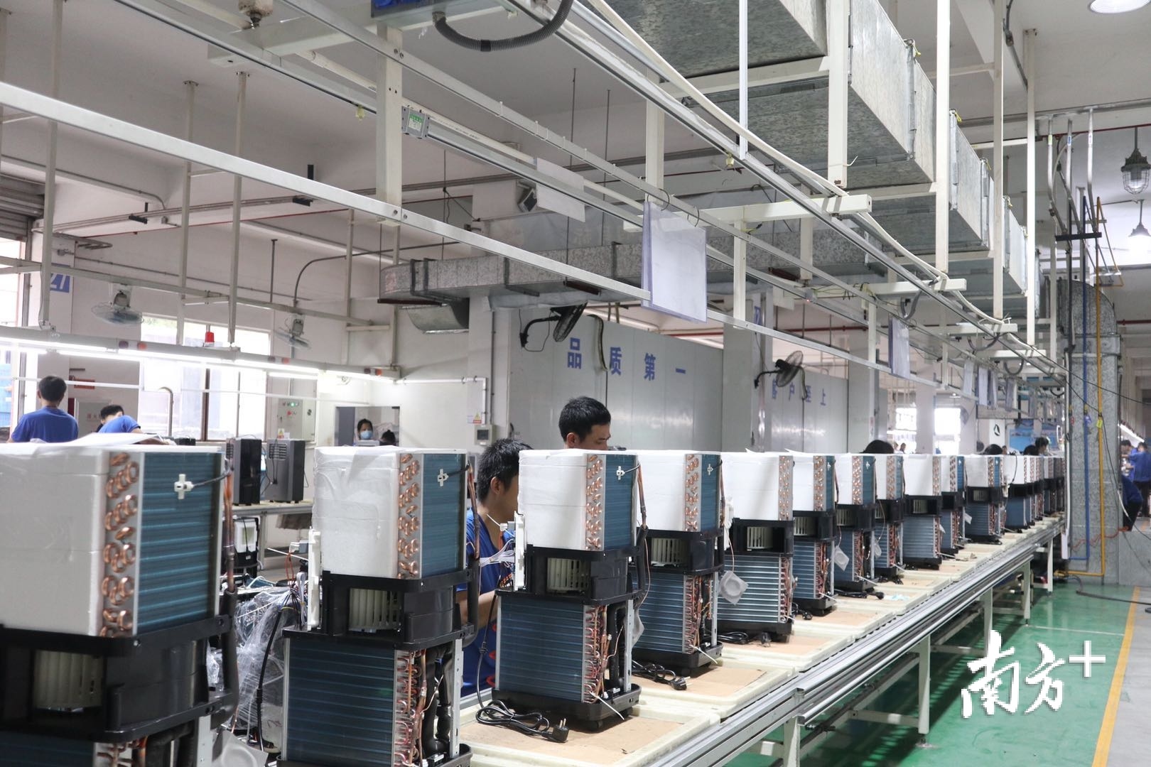 U型全流程生产线飞速运作,80多道流程有条不紊进行,仓库里数万件移动空调、抽湿机正准备发往海外。