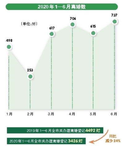 今年1—6月全市共办理离婚登记3426对,同比减少24%。今年,为加强疫情防控,江门市婚姻登记机关一度暂停开展婚姻登记服务,疫情防控形势向好后,陆续开展预约登记,限制办理人数和时段,使得目前婚姻登记人数明显减少,与去年同期相比要少很多。
