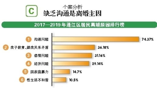 影响离婚的因素多种多样,包括缺乏沟通、经济原因、家庭暴力、婚外情及家庭琐事等。晴海天社会工作综合服务中心从2017年至2019年,针对蓬江区600对准离婚夫妻进行统计分析,其中缺乏沟通、亲子姻亲问题成为离婚的重要原因。管中窥豹,从这个个案也反映了全市影响离婚的因素。