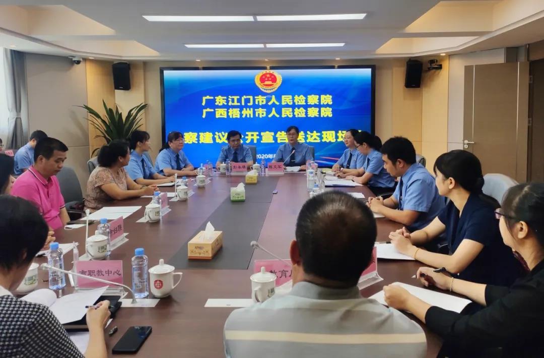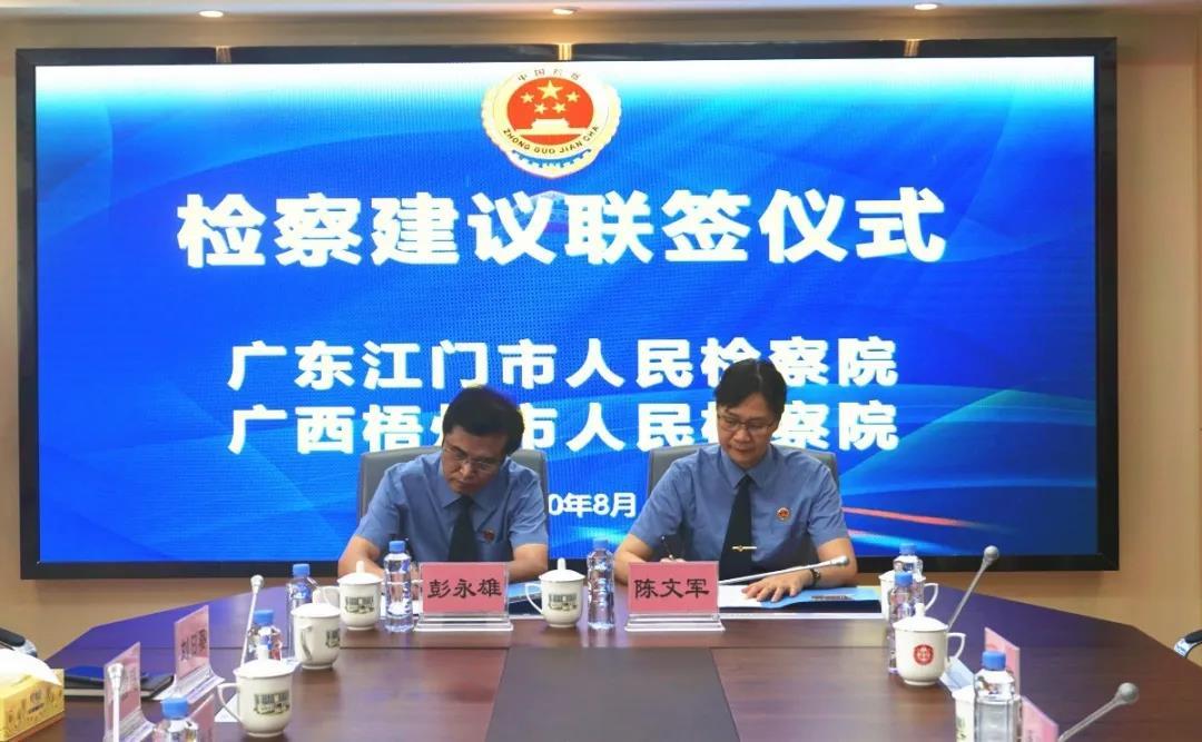 2020年8月13日,一场跨越两百多公里的检察建议联签仪式及公开送达现场会在广西壮族自治区梧州市人民检察院举行。会上,广东省江门市人民检察院党组成员、副检察长陈文军和梧州市检察院党组成员、副检察长彭永雄分别代表两地检察院向被建议单位公开宣告送达检察建议。
