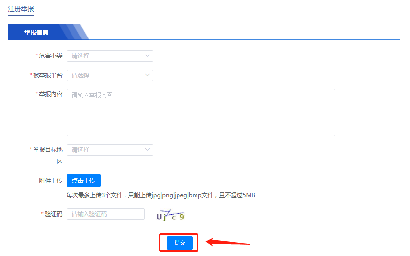 进入举报信息页面,填写相关信息后,点击【提交】。