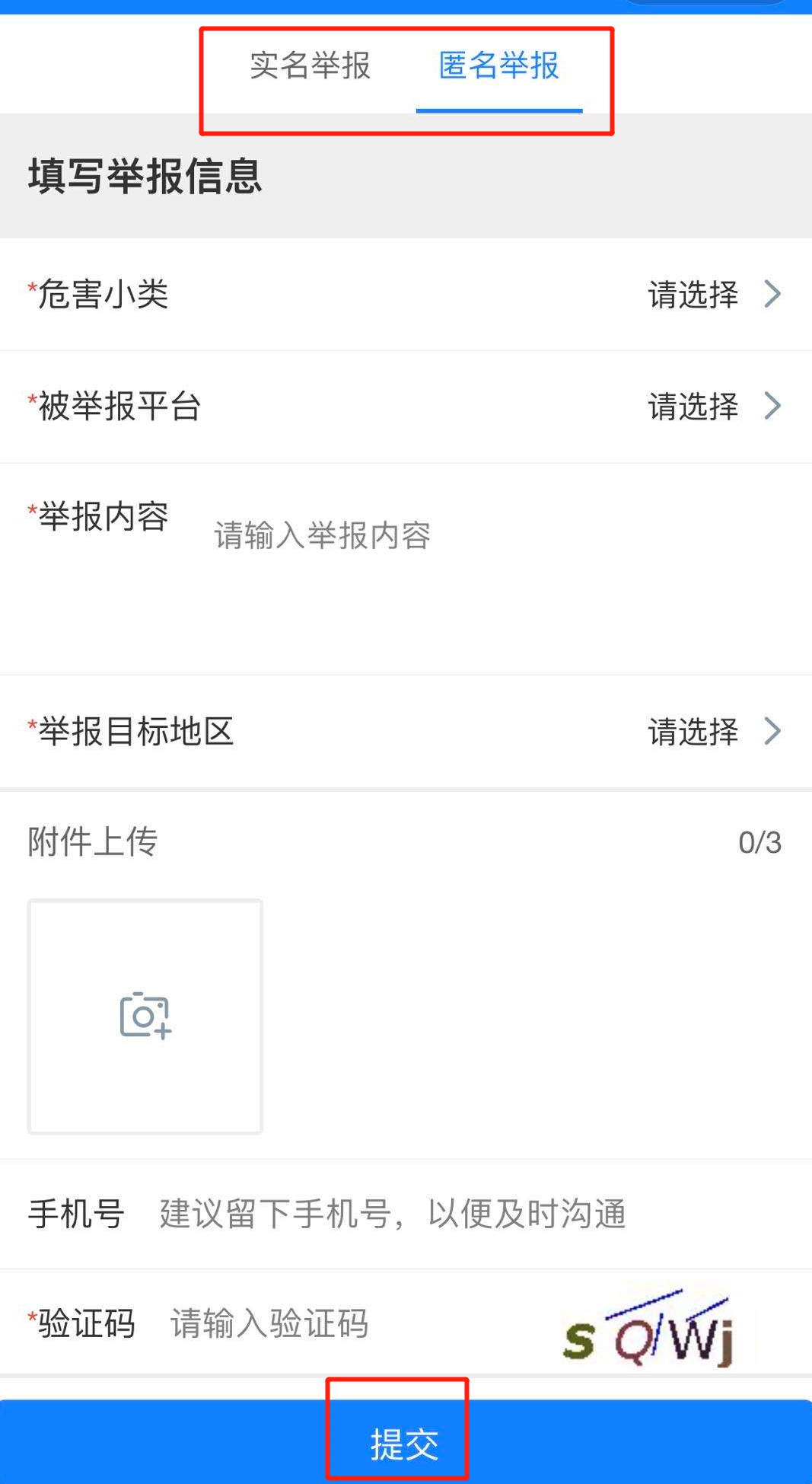 第四步:选择【实名举报】或【匿名举报】,填写相关信息后,点击【提交】。