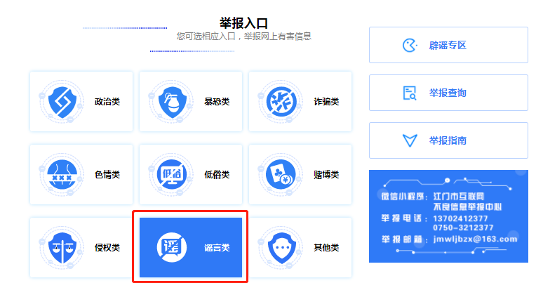 需要注意的是,举报平台仅用于受理、处置互联网上涉及江门或江门属地网站出现的违法和不良信息举报,提供政治类、暴恐类、诈骗类、色情类、低俗类、赌博类、侵权类、谣言类、其他类等8类信息的举报服务,还开辟了“涉疫情防控有害信息举报专区”“涉未成年人网上有害信息举报专区”和“辟谣专区”等三个备受网民关注的举报、查询专区。