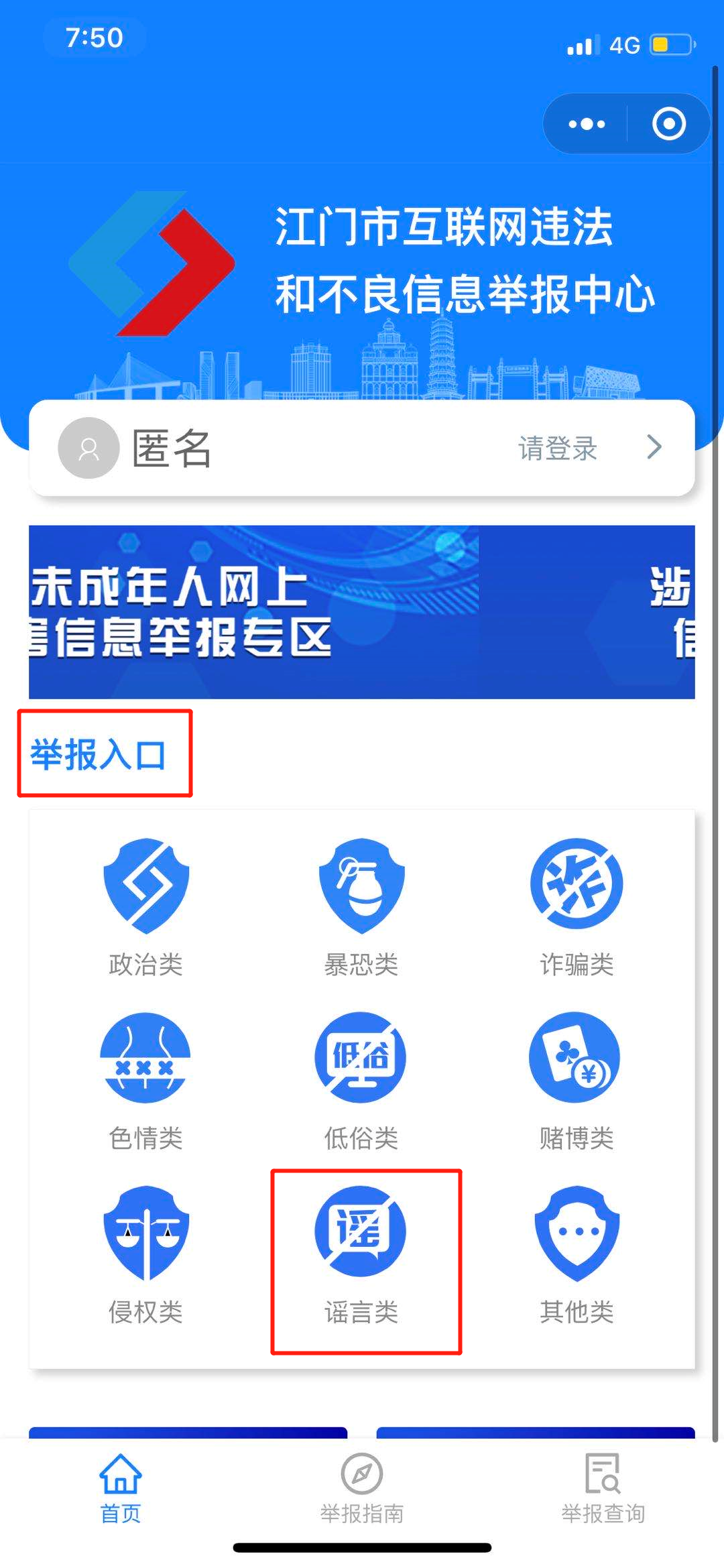 选择相应类型【举报入口】(以“谣言类为例”)。