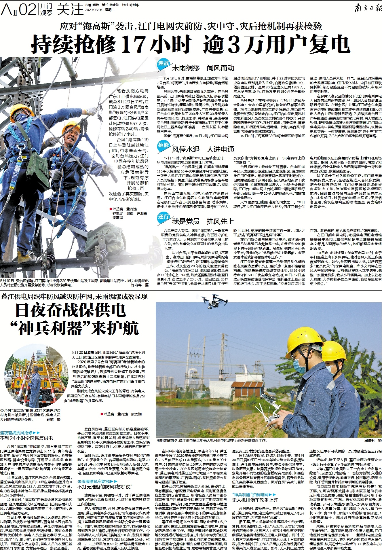 笔者从南方电网广东江门供电局获悉,截至8月20日7时,江门逾3万受台风“海高斯”影响的公线用户全部复电,江门供电局累计出动抢修557人次、抢修车辆240辆,持续抢修近17小时。