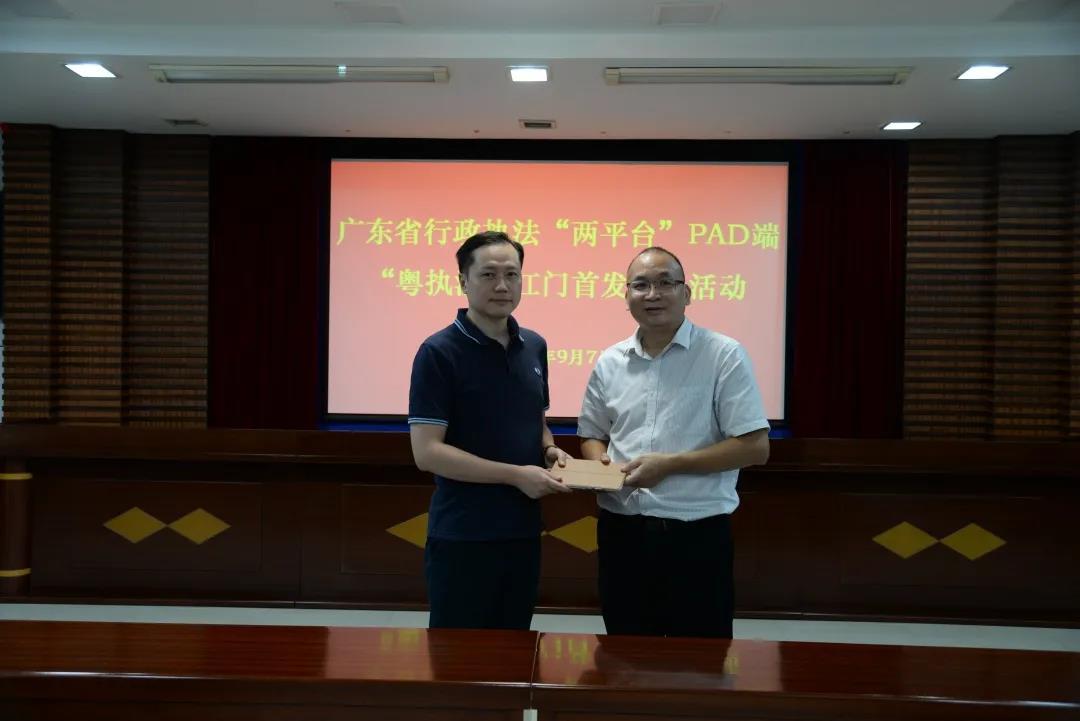 9月7日,“两平台”项目组新开发的 PAD端“粤执法”功能在江门市首发上线。省司法厅行政执法协调监督处处长赵仕瑞、四级调研员曹智勇,市政务服务数据管理局党组成员、副局长李茜,市市场监督管理局、市城市管理和综合执法局等相关负责同志见证了上线活动。活动由市司法局党组成员、副局长陈勇同志主持。