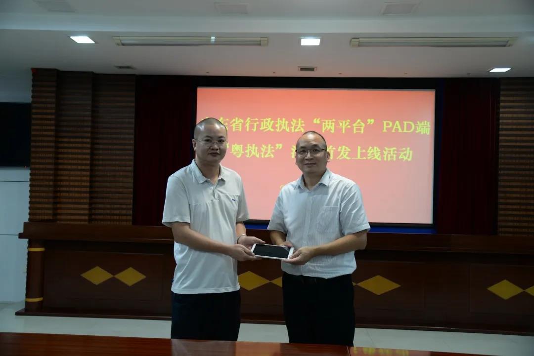 赵仕瑞现场向市市场监督管理局、市城市管理和综合执法局移交了用于移动执法的PAD,行政执法人员今后可通过PAD端“粤执法”开展执法办案。他介绍,PAD端“粤执法”应用是“两平台”二期工程新增的功能,既具备手机端快速出击、科学取证的优势功能,又能兼顾执法人员电脑办公的使用习惯。他指出,在全省司法行政工作会议上,江门市司法局被省厅选为6家发言单位之一,充分体现了省厅对江门市司法行政工作的肯定。江门市自被列为行政执法“两平台”第二批试点市以来,在行政执法信息化、智能化方面取得了非常好的效果,为“两平台”在全省的推广应用工作起到了良好的示范引领作用。此次PAD端“粤执法”应用选在江门市首发上线,就是希望江门市能继续当好“领头雁”,加快推进步伐,为实现全省四级全覆盖贡献江门经验。