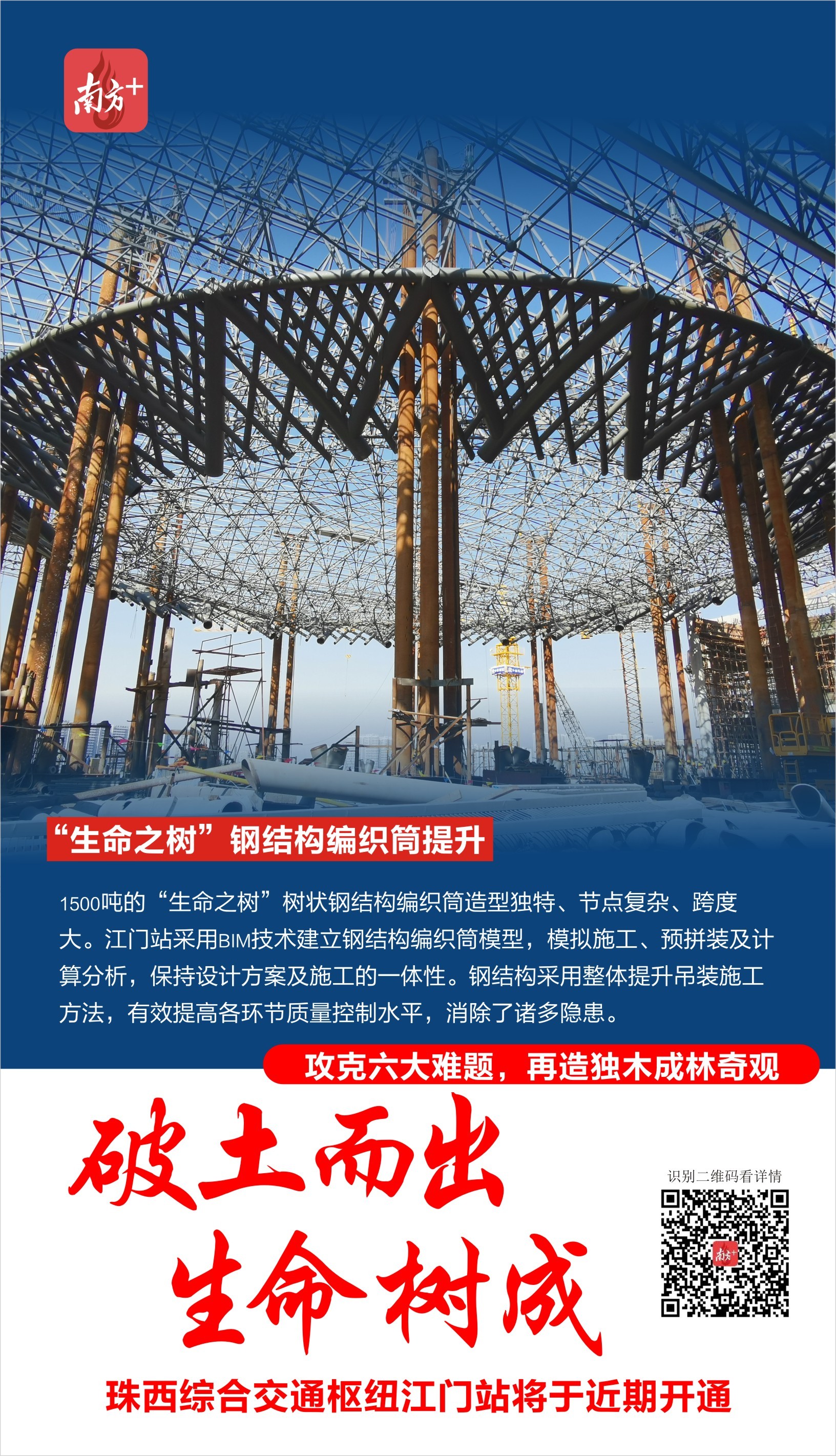 江门站“生命之树”树状钢结构编织筒造型独特、节点复杂、跨度大,重达1500吨的钢结构施工成了项目的一大难题。