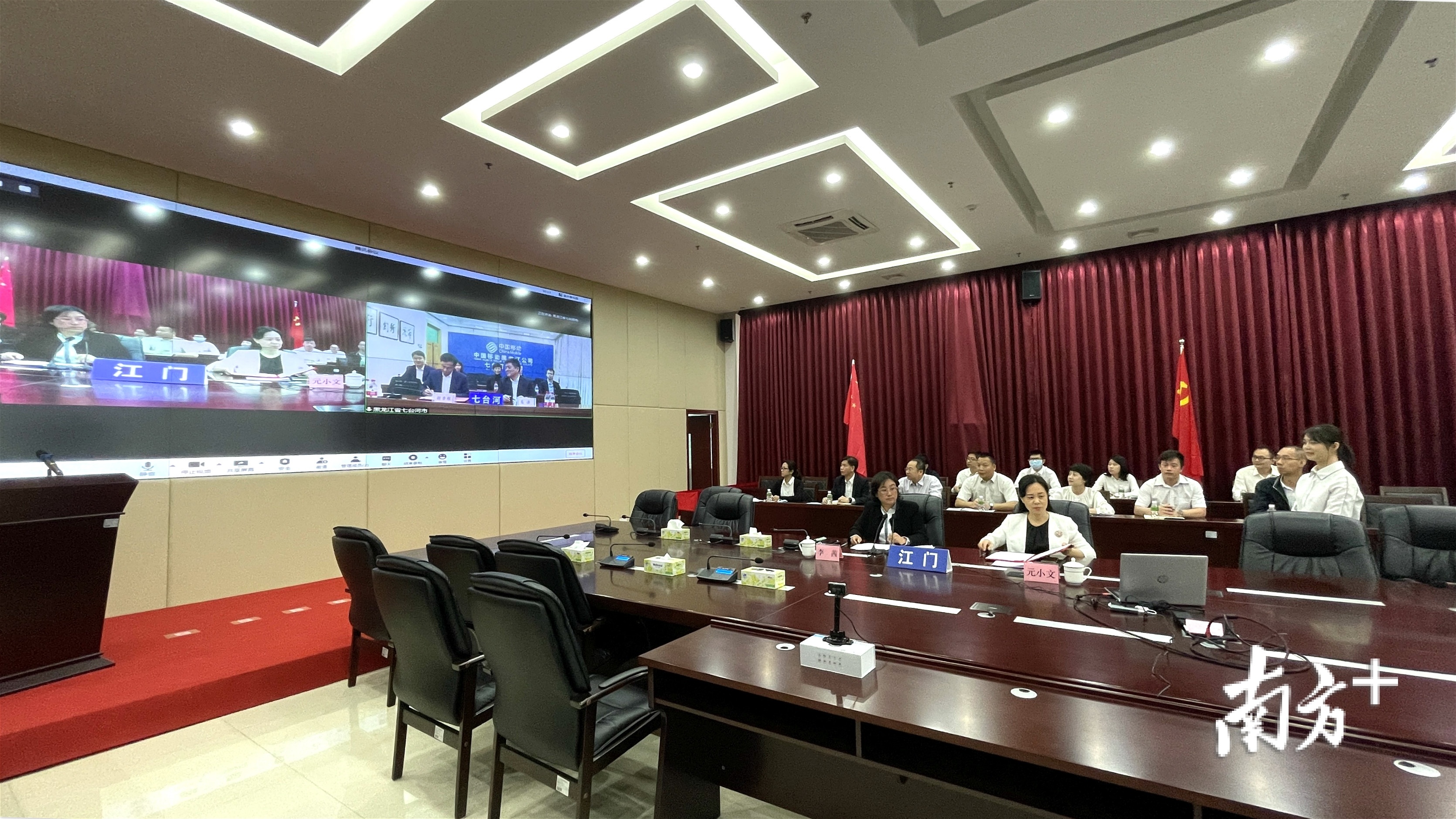 江门市政务服务数据管理局与黑龙江省七台河市营商环境建设监督局通过“云上签”的方式签订了政务服务“跨省通办”合作协议。李霭莹摄