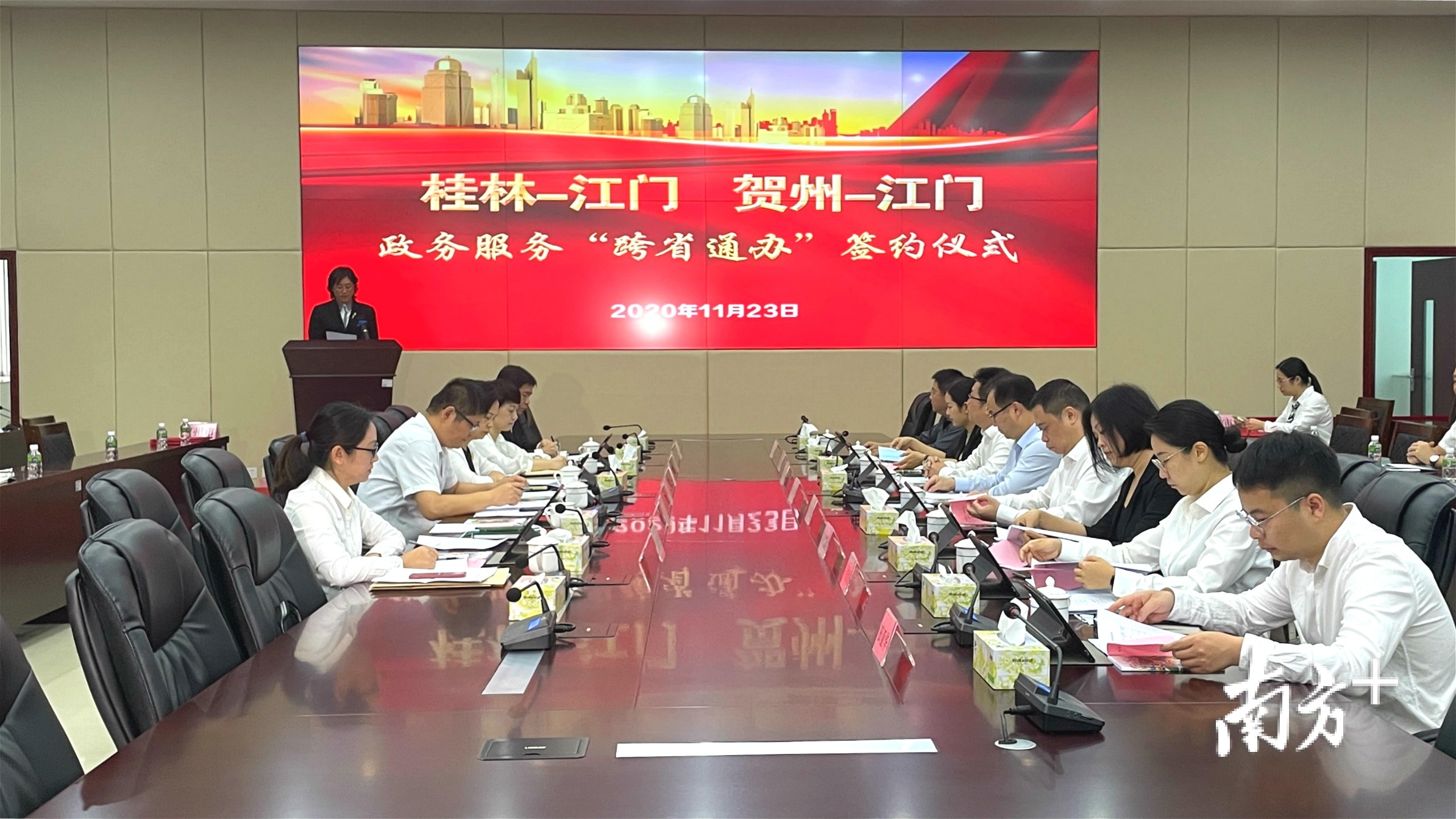 11月23日,江门市政务服务数据管理局与广西壮族自治区桂林市行政审批局、贺州市行政审批局,以及黑龙江省七台河市营商环境建设监督局签订了政务服务“跨省通办”合作协议,成为全省首个同时与3个省外城市实现“跨省通办”的地级市。