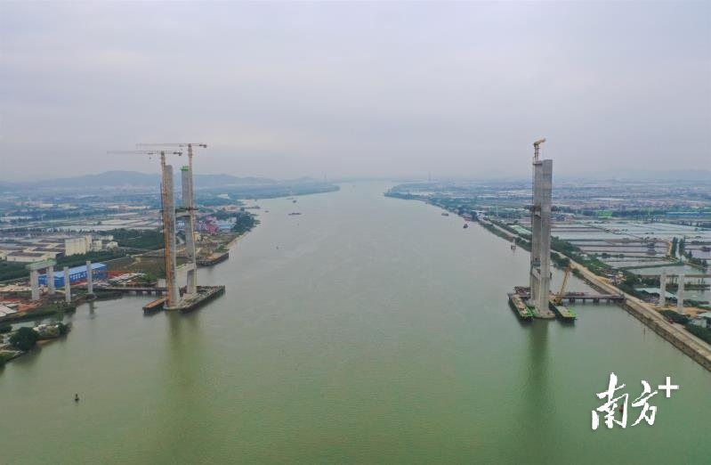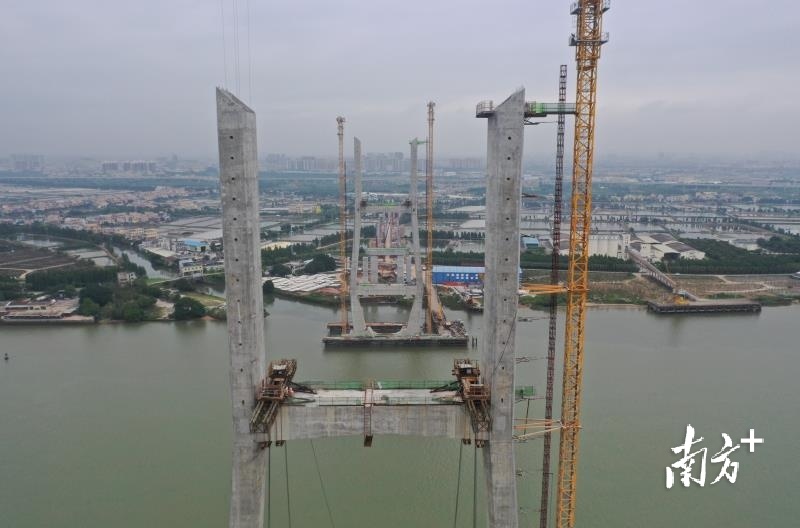在磨刀门西江特大桥施工现场,记者在现场看到,大型机械正在把大桥所需的钢梁吊装到半空中,并进行安装。西侧引桥的桥面已经铺设完毕,宛如一条长龙横卧在半空。两座高度超过120米的索塔矗立在浩瀚的西江中,一东一西遥遥相望。