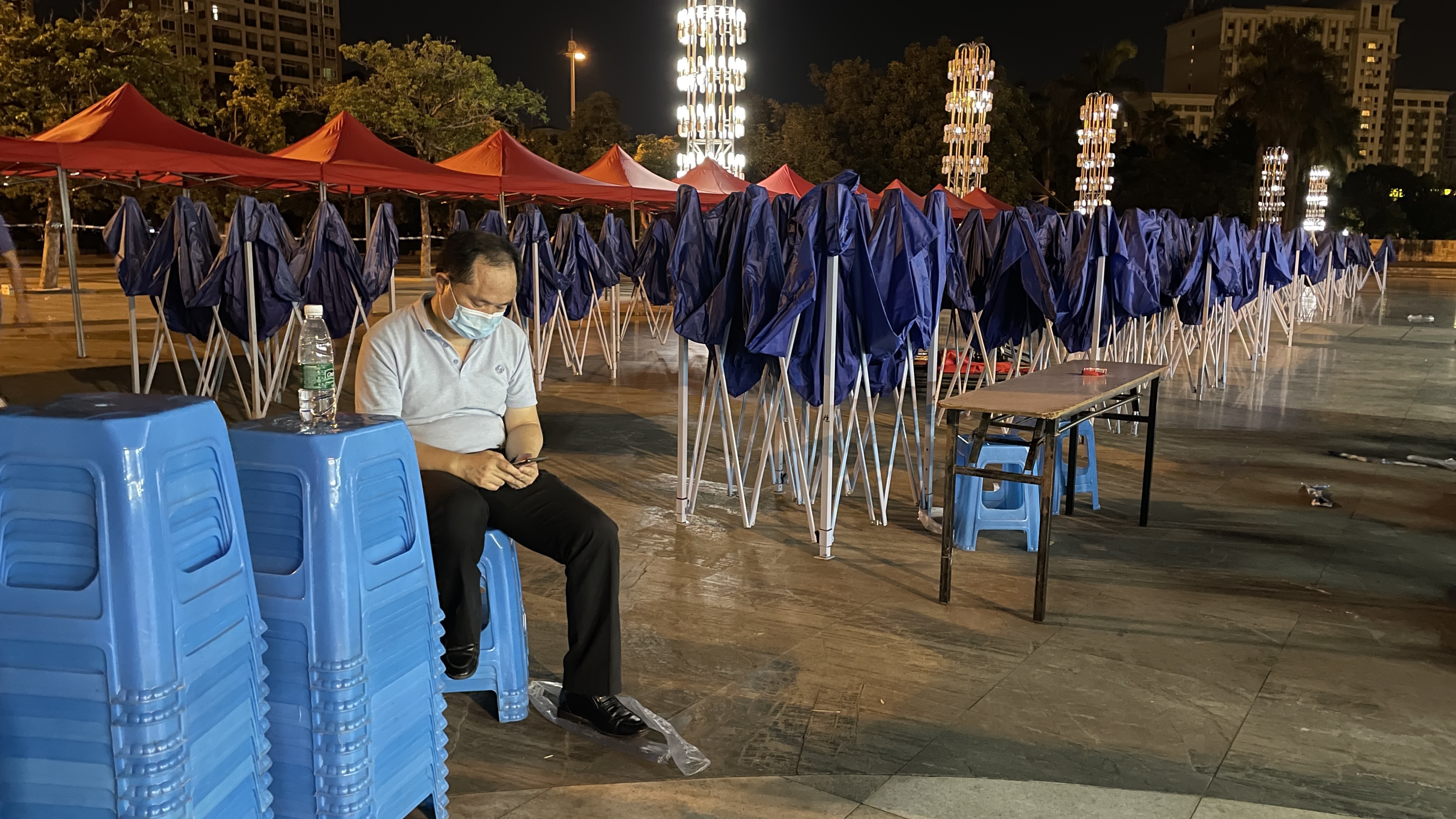 时间在流逝,人们在忙碌。此时,已是清晨6点,芒种刚过,气温不低。新会区人民会堂检测点囤放着一批还没打开的帐篷,预计在今天中午启用。