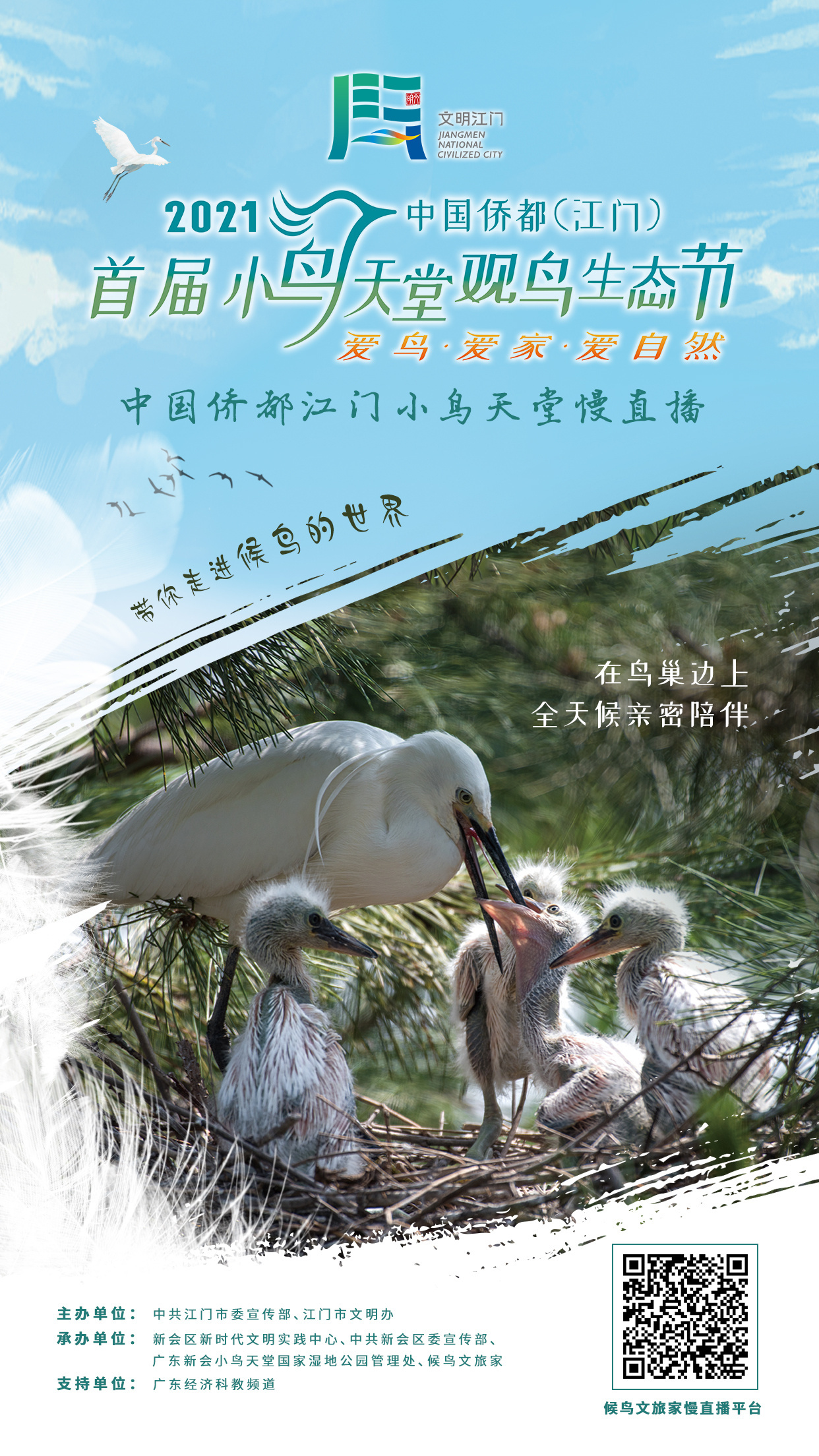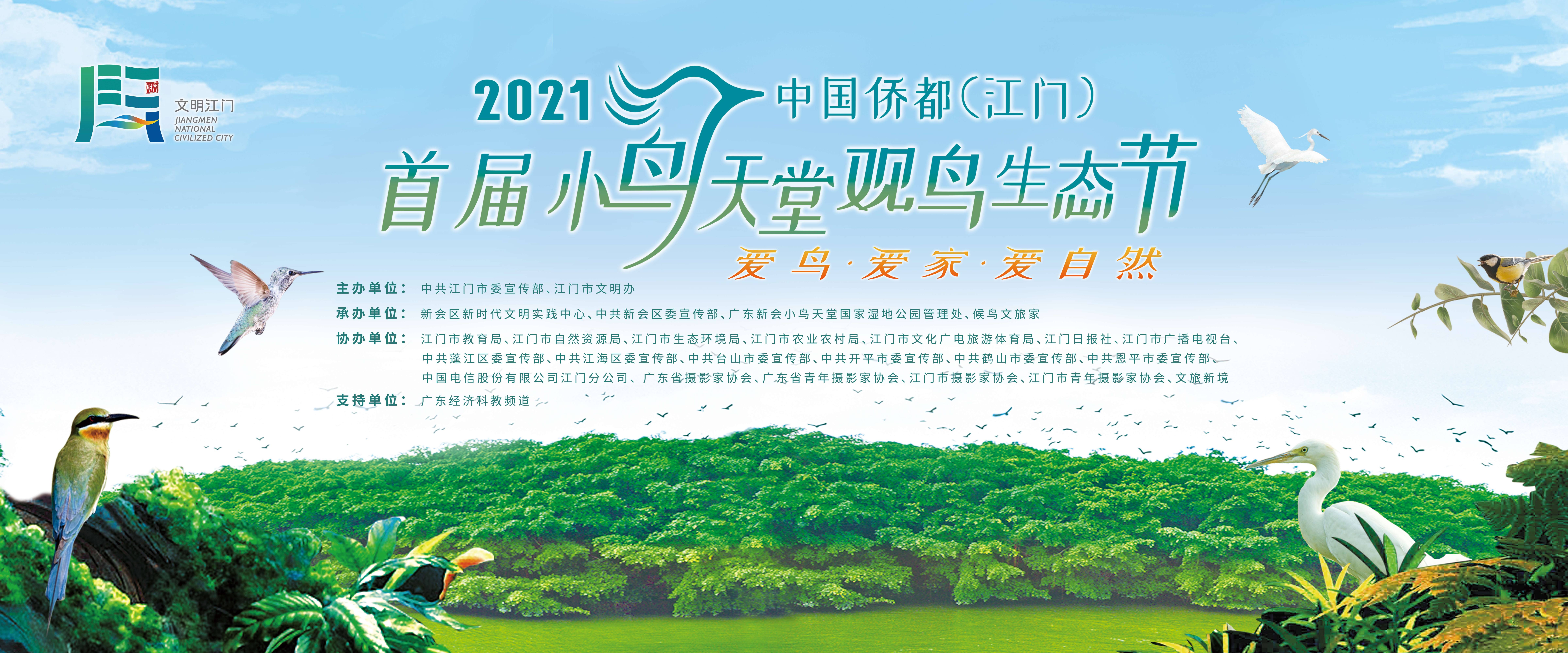 此次生态节举办小鸟天堂观鸟慢直播、小鸟天堂“云赏鸟”、“爱鸟·爱家·爱自然”鸟类生态摄影大赛暨侨乡观鸟胜地推选活动、短视频大赛、主题征文大赛5大活动。