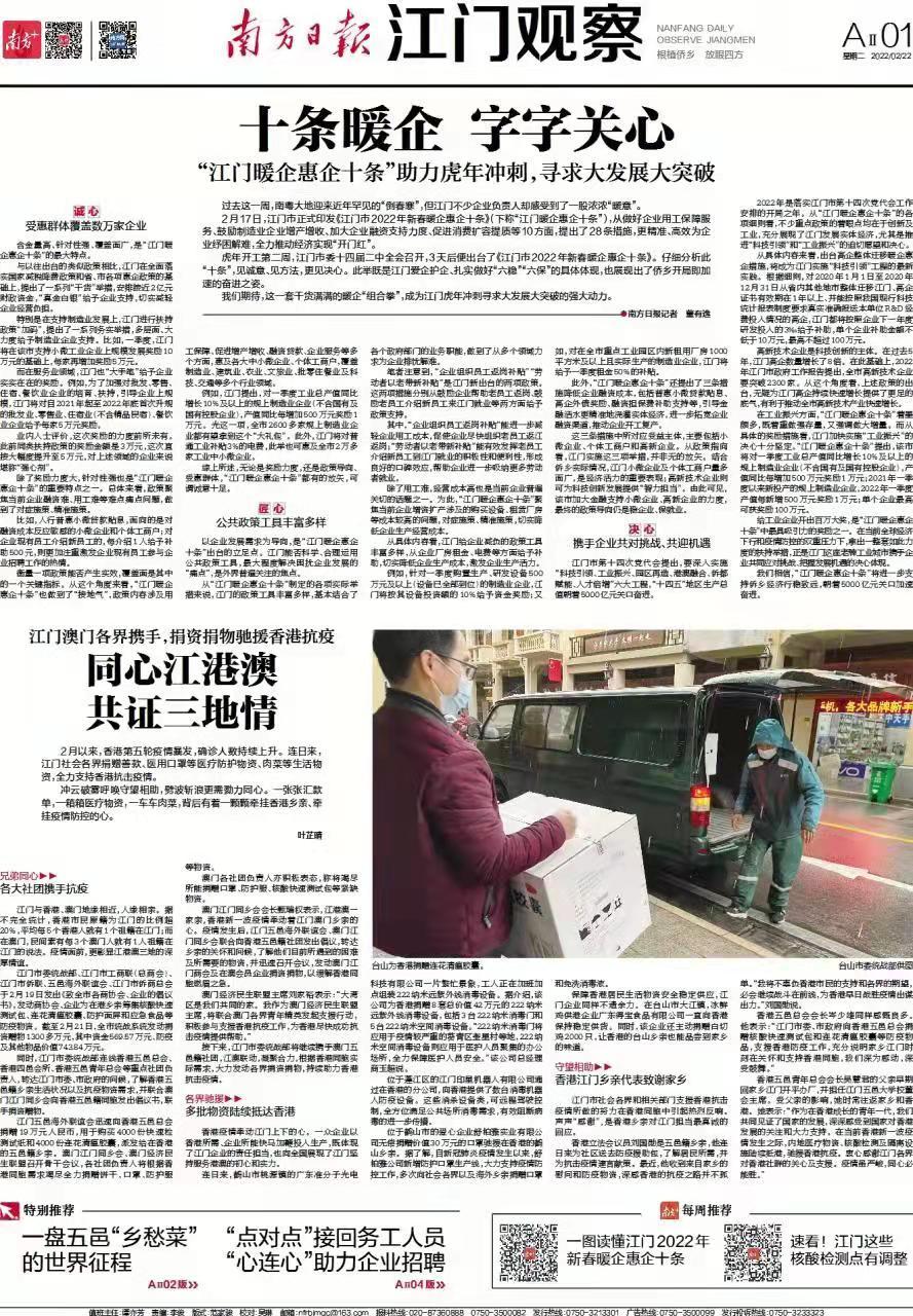 香港疫情牵动江门上下的心。一众企业以香港所需、企业所能快马加鞭投入生产,既体现了江门企业的责任担当,也向全国展现了江门坚持服务港澳的初心和实力。