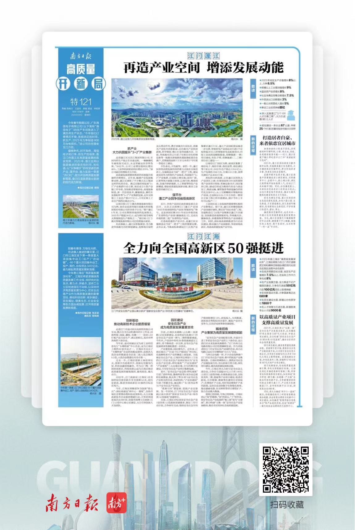 在这催人奋进的春天里,江海区将紧紧围绕高质量发展工作主线,找好找对出发点、着力点、突破点,坚持工业立区制造强区不动摇,以实体经济高质量发展为中心,把安全应急产业作为高质量发展的重要支柱,推动科技创新、城乡融合、民生福祉、绿美生态、社会安全等各方面协调发展,打开高质量发展新局面。详情>>