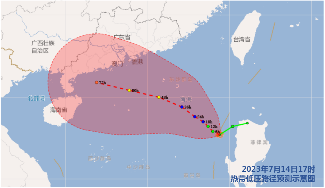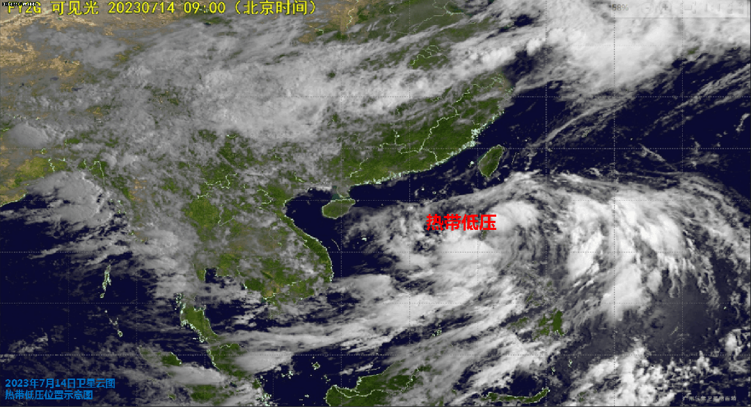 14日上午11时,原位于菲律宾吕宋岛的扰动云团已加强为热带低压,下午17时,其中心距离江门市沿海东南方约830公里,中心附近最大风力7级(15米/秒)。