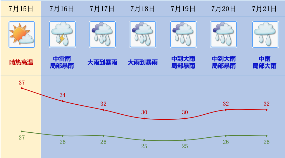 预计15日继续吹“台风牌空调外机”,最高气温仍可达37度或以上,16日雷雨出场,17日风雨加大,击退高温。